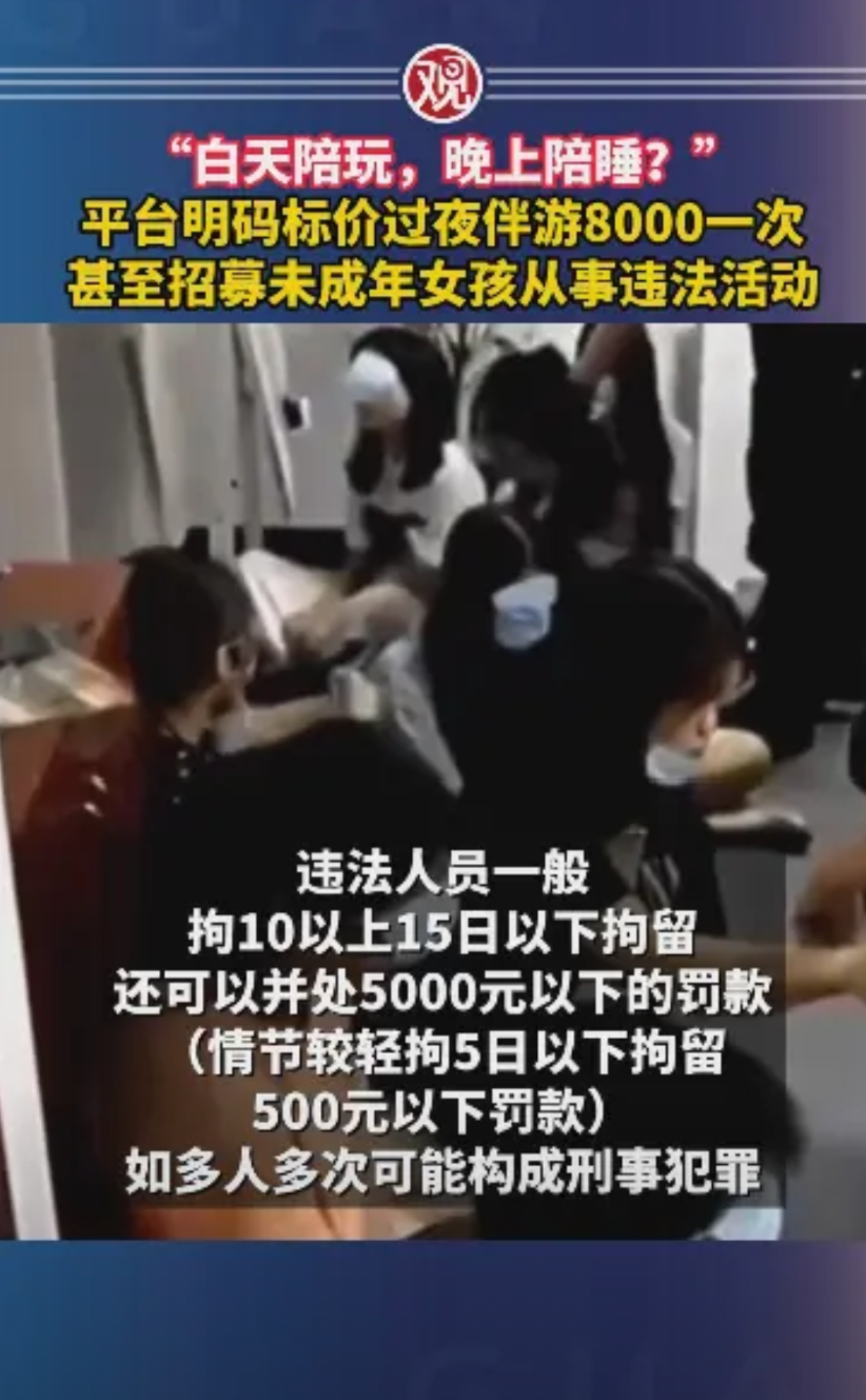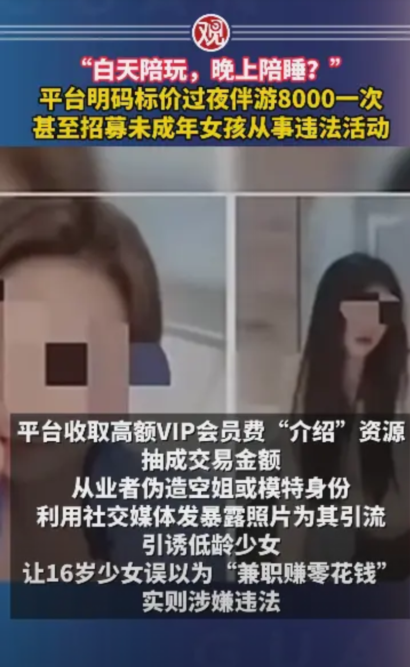 “防不胜防!”男子想体验伴游服务,竟然发现需要8000元一次,怀疑有猫腻,记者调查后,发现平台明码标价,过夜伴游8000元一次,甚至招募未成年女孩从事违法活动。表面陪玩,实则明码标价“包夜”,还引诱未成年人“兼职”!网友:白天陪玩,晚上陪睡?