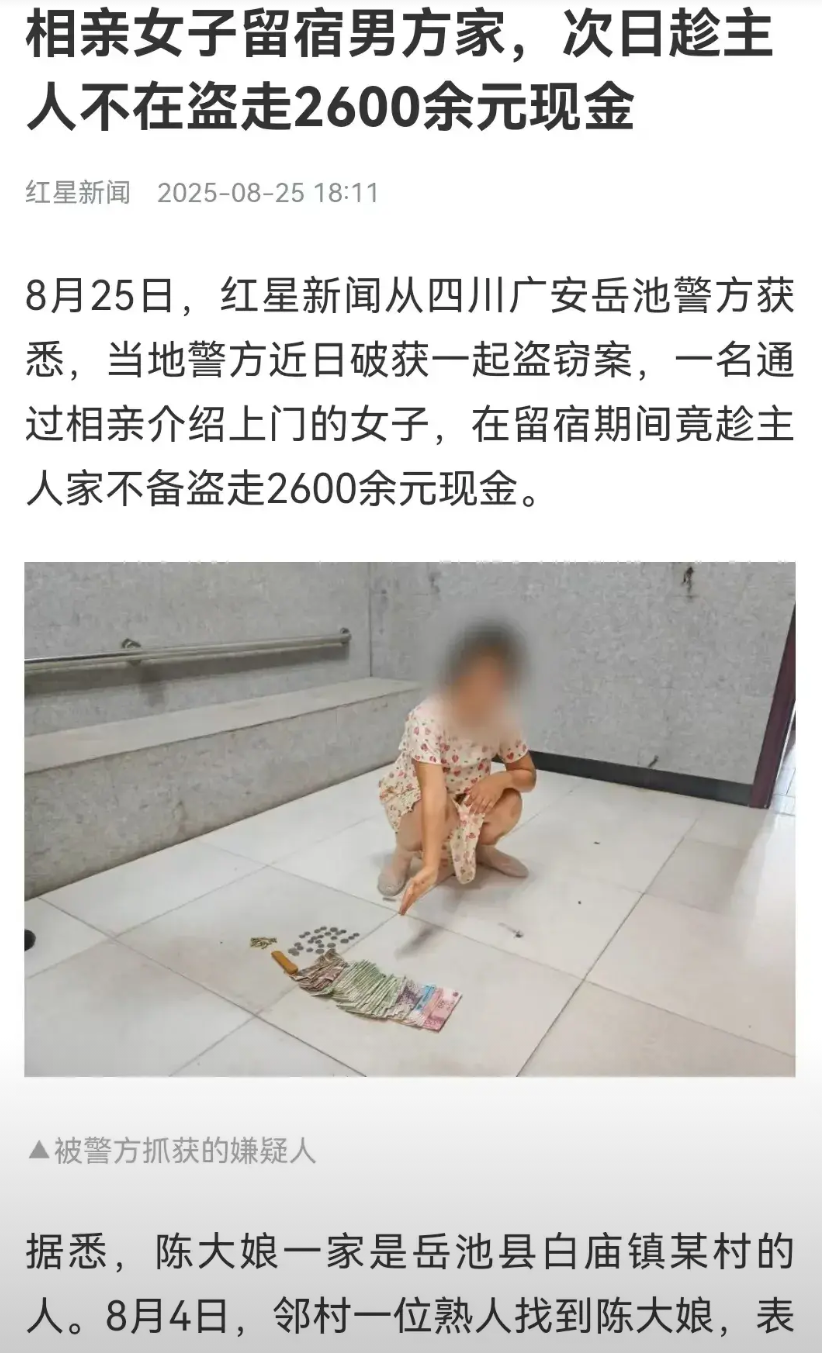 四川,大妈务农回家后发现柜子被人翻动过,心中大感不妙,于是慌忙打开柜子检查,发现自己经常拿来放证件和钱的挎包不见了。大妈心中一惊,不会是昨天相亲留宿的姑娘偷走了吧?