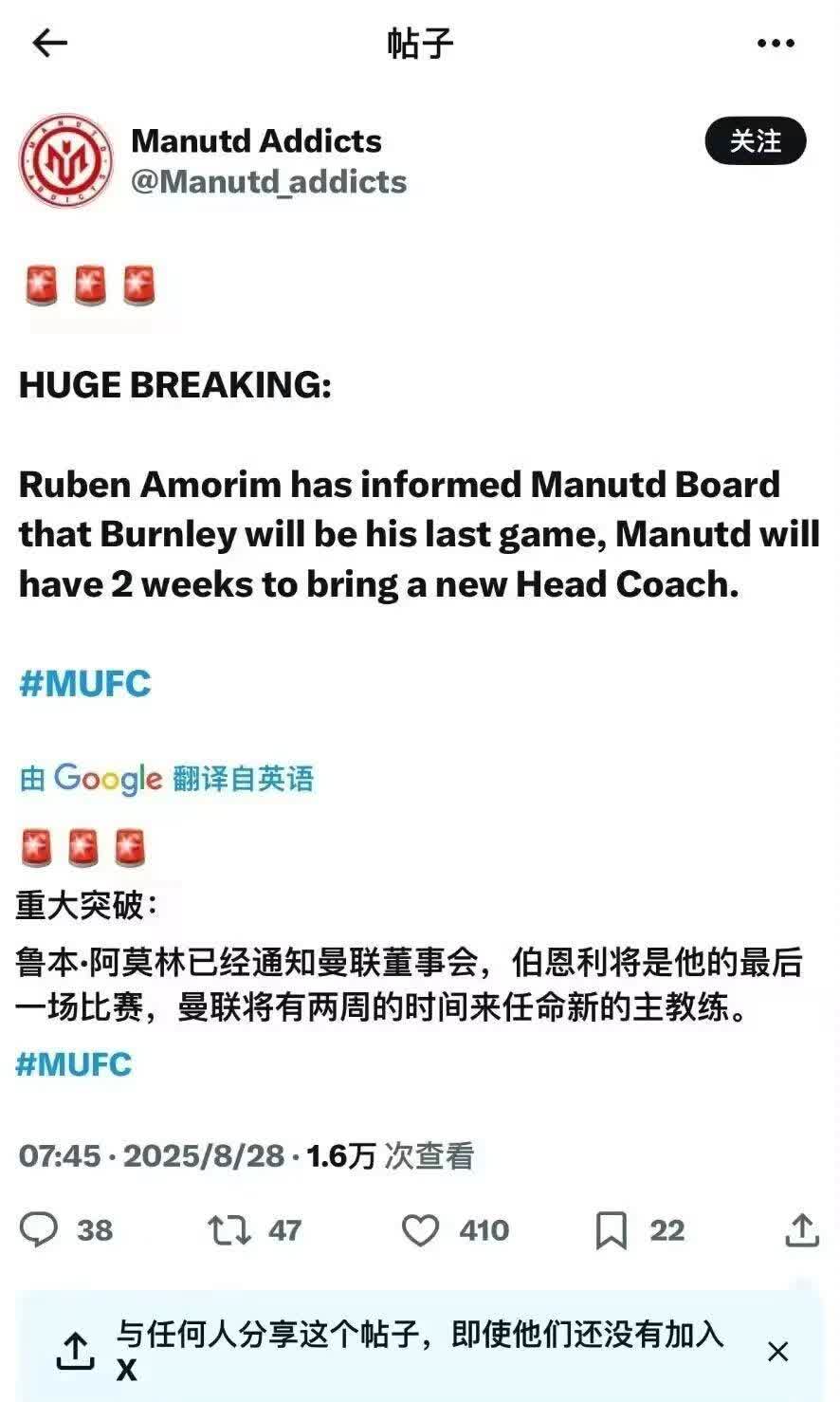 英国那边新闻,阿莫林本周对伯恩利是最后一场比赛,曼联有两周时间选新帅! 曼