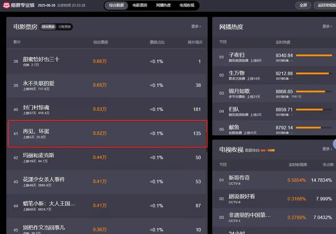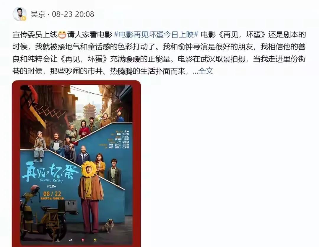 吴京离开军旅题材电影后真的电影毫无杀伤力,一部《再见,坏蛋》才上映短短4天就急冲冲下架了,票房也才只有25万,远不及成龙的电影,果然离开了军旅题材电影后,吴京真的毫无“杀伤力”了,票房平平,角色也不出彩,想当年《流浪地球》,《长津湖》和《战狼2》等,每一部都是票房过亿的