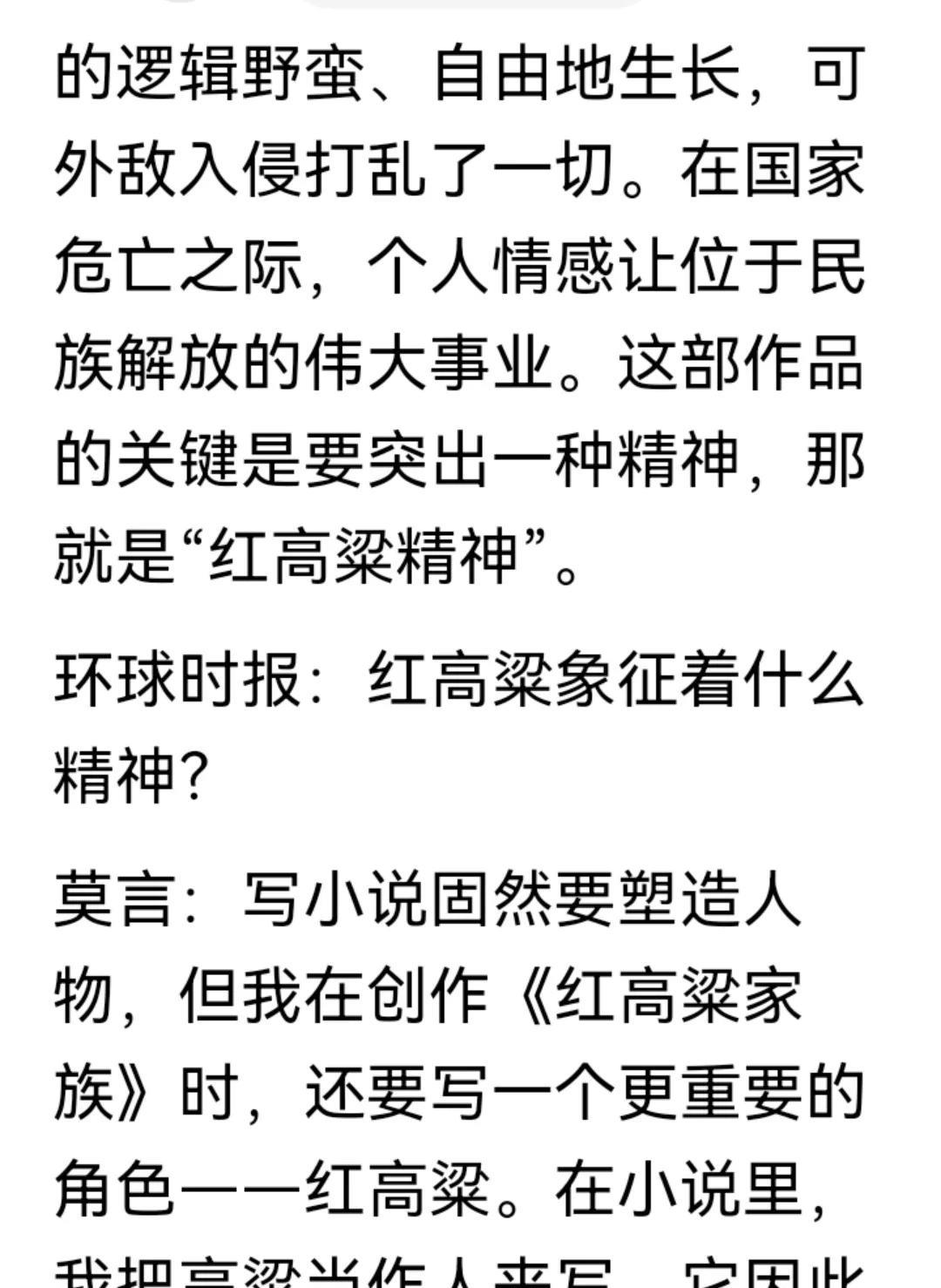 《红高粱》写的是红高粱精神? 9月27日,国家大剧院原创民族歌剧《红高粱》首演。 根据环球时报的报道采访茣言,该剧展现普通民众在民族危亡时刻觉醒和抗争,莫言说,今年是抗日战争80周年,而红高粱家族创作于1985年,突出了高粱精神,把红高粱当人来写,小说里所有人物都具备这种不屈不饶,昂然向上的奋斗与抗争精神。 莫言是个有争议的人物,而且他的很多言论摆在那里,虽然人嘴两张皮,但事实胜于雄辩,有就是有,没有说不成有! 但红高粱的观后感,红高粱地里土匪余占鳌和九儿的乱搞,然后抗战的是土匪,国民党。 有几点疑问,莫言说的是自己的作品吗?莫言爱樱在会有抗战精神吗?在山东抗战的是土匪吗? 先翻一下莫言的历史: 莫言在1985年前作品的目的是什么? 在莫言的著作《我们时代的写作,对话酒国生死疲劳》一书中,第248页,张旭东和莫言对话。 莫:我一开始就是用小说…。 张:你用小说…(笑)。 莫:我一开始就是用小说…,每部小说按照50年代的标准,都是极…,一个也跑不了。 有如此立场的作者,靠他笔下的人物能有抗争精神,那才是活见鬼。 在抗战胜利80周年,把莫言的红高粱用这种方式推出,又会引起大讨论,有人支持,但大多数人还是不认同的,这种把文艺和利益挂钩,蹭热度,和社会隔离的展现,实际消耗的是民心!#请大家回答资本垄断对人类的危害# #莫言# #红高粱#