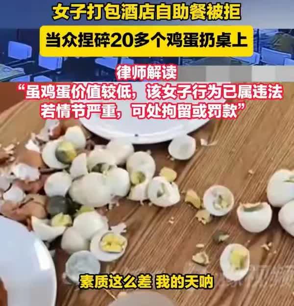 捏鸡蛋虽是小事,但其行为却极其恶劣,反映出一个人的道德素养。 今日,我从网上刷到一则消息,8月27日在陕西某地发生了这样一件事。一位女子带着小孩去吃自助餐,只因饭店拒绝其将吃不完的鸡蛋外带,该女子便把一盘十几个鸡蛋挨个捏碎,弄得满桌都是掰开捏碎的熟鸡蛋。这一幕,不仅让周围的顾客目瞪口呆,也让无数网友惊愕不已! 女子的这种行为,对酒店而言属于违约行为。虽说女子捏坏的这盘鸡蛋价值不高,但她的行径着实恶劣,令人气愤不已。常言道,贪污和浪费皆是一种犯罪。这并非单纯的浪费,而是有意损坏,性质比浪费更为严重。从法律层面来讲,女子的行为已涉嫌故意损坏财物罪,只是被损坏的鸡蛋价值较低罢了!