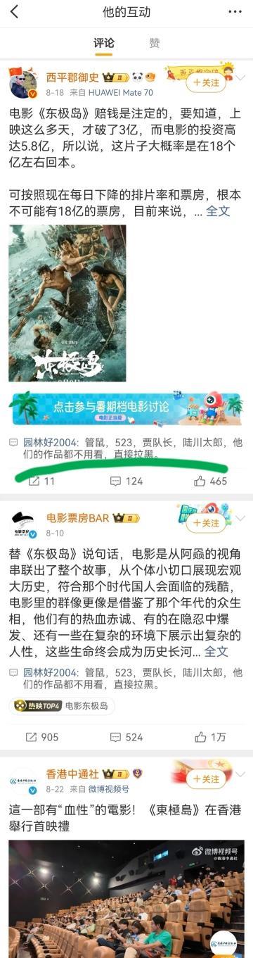 《东极岛》被黑有幕后推手,如今被抓到机器人无差别在评论区疯狂输出一字不改的黑评。到底《东极岛》惹怒了谁?遭到漫天大黑,恶意歪曲,谩骂狙击。好好查查啊!@新华社 @人民网