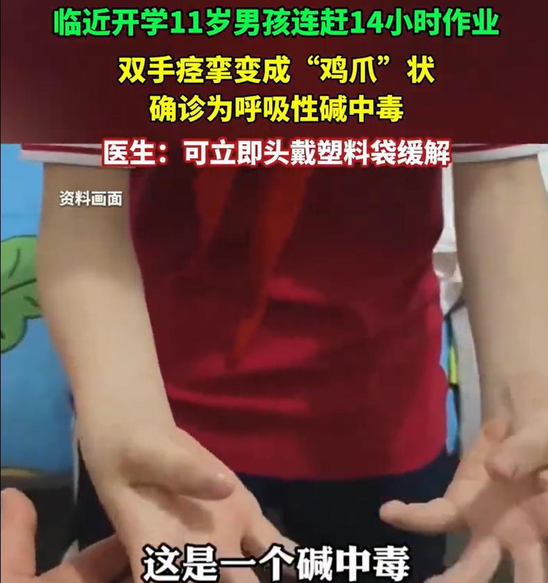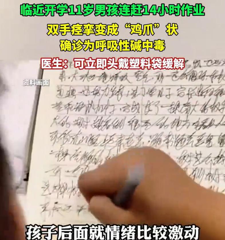 担心的事情还是发生了!湖南长沙,临近开学,一名11岁男孩的暑假作业却还没写完,于是突击赶作业,从早上8点写到晚上10点,眼看作业就要写完,孩子却突然头晕,四肢麻木,送到医院后确诊为呼吸性碱中毒 孩子的妈妈介绍,儿子在暑假比较放松,作业没写完,男孩从早上八点开始埋头写,除了吃饭上厕所,几乎没怎么动,一直写到晚上十点多,后面情绪就有些激动,突然感到头晕、胸闷,手指不受控地蜷成了“鸡爪状”,僵硬麻木,呼吸也越来越难受 家人赶紧把他送到医院,一检查才知道,孩子是“呼吸性碱中毒”。简单来说,就是长时间紧张、情绪激动,导致呼吸过快过深,体内二氧化碳排出太多,打破了酸碱平衡 孩子妈妈事后回忆起来,语气里都是心疼和后悔。她说,看到孩子积压了那么多作业,临开学自己也着急,就在旁边不停催。结果越催孩子越紧张,越写越焦虑,最后身体撑不住了 说实话,假期放松、作业积留、开学前疯狂补、家长催、孩子赶……很多人在这个孩子身上,仿佛看到了曾经的自己,或者正在为孩子作业发愁的现在 所以说,平时就要帮孩子养成规律学习的习惯,别都堆到最后,有时候,缓一缓、松一口气,可能比一直埋头苦干更有效