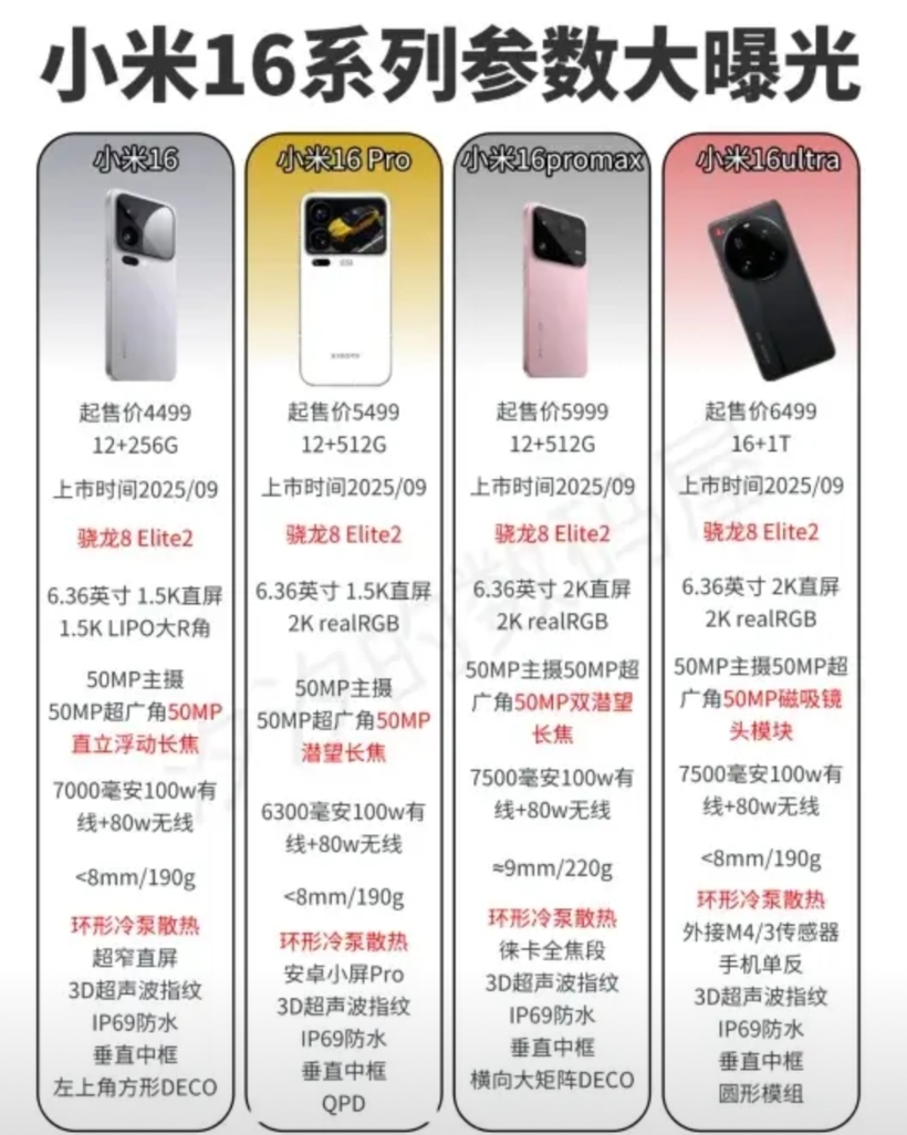 小米手机16系列全系参数曝光!米粉速瞅 小米16系列发布时间确定9月25日左右,将首发搭载高通骁龙8 Elite迭代产品骁龙8 Elite Gen5。 以下为目前已知信息: 影像配置(主摄+长焦+超广角): 小米16:OV50Q(50Mp+1/1.3+QPD)+2.6X JN5+JN5 小米16 Pro:思特威590(50Mp+1/1.28+LOFIC+2.0QPD)+5X JN5+JN5 小米16 (Pro) Max:思特威590+5X GN8(1/1.95+iDCG+DSG QPD)+JN5 电池配置: 小米16:7000mah± 小米16 Pro:6300mah± 小米16 (Pro) Max:7500mah± 充电配置: 全系100W 屏幕配置: (Pro) Max将搭载华星全新Real-RGB排列屏幕,清晰度等效2K 外围配置: 全系相比上代有所提升