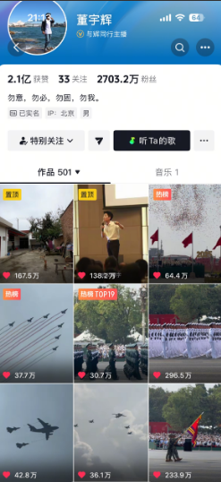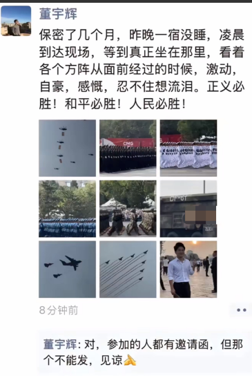 天哪,咱也是凭个人实力(搜遍全网)看到了宇辉的朋友圈(图2),宇辉今天妥妥的网上冲浪达人,破天荒在抖音发布了7条观礼阅兵的视频后(图4),又在自己的朋友圈发了上午阅兵的现场图,感觉从上午阅兵结束到下午,宇辉就没离开过社交平台,各种发视频,回复网友留言以表达自己的激动和自豪之情。虽然宇辉说自己一宿没睡,但宇辉看得出来宇辉是真的自豪,社交平台的最后一个视频是观礼结束,现场众人合唱《歌唱祖国》,宇辉从头到尾唱的超大声,唱的铿锵有力,孩子今天太激动了,感觉嗓子要吼哑。宇辉在现场很激动很自豪,我在屏幕前也很激动很自豪,何其有幸生于华夏,为我们都是中国人自豪。