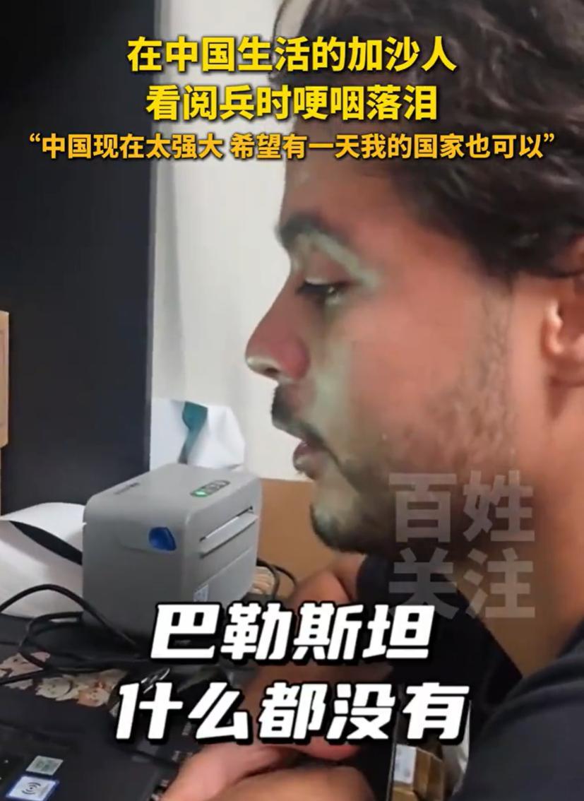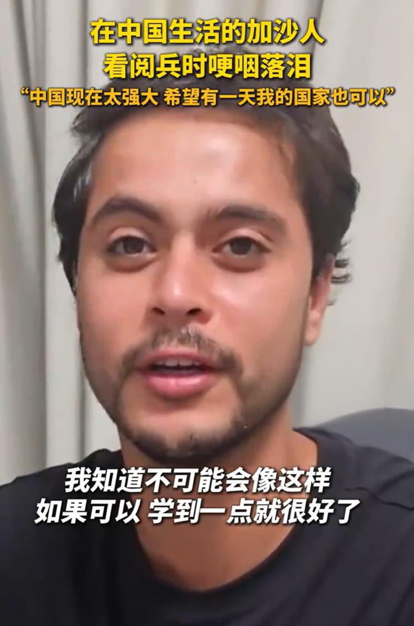 看哭了!一位在中国生活的加沙男子在电脑前看阅兵,看着看着,眼泪就不自觉的流了下来,朋友看到后上前安慰,男子表示:希望有一天我的国家也可以! 视频中,男子一边看着阅兵,一边抹着眼泪,很显然,这样的场景给他带来不小的触动,在朋友安慰时,他也是有感而发 男子表示:现在巴勒斯坦什么都没有,如果你强壮,别人都会怕你,所有国家都会尊重你,因为现在中国强大了,所以都没人敢说坏话,希望有一天我的国家也可以,我知道不可能会这样,但学到一点就可以了 说实话,看到他的话真的感触很深,阅兵在我们眼里,可能是一场仪式,一份庄严的展示,可在他眼里,是一种对安全感的羡慕 因为强大意味着不用低声下气,意味着你有资格被尊重。对我们来说习以为常的稳定,他却只能透过屏幕去感受 这个场景让我想起一句很现实的话:一个人能不能挺直腰板,往往不是靠个人,而是靠身后的家。如果家足够稳固,他走到哪都不怕。国家的强盛,对普通人来说,其实就是最大的底气