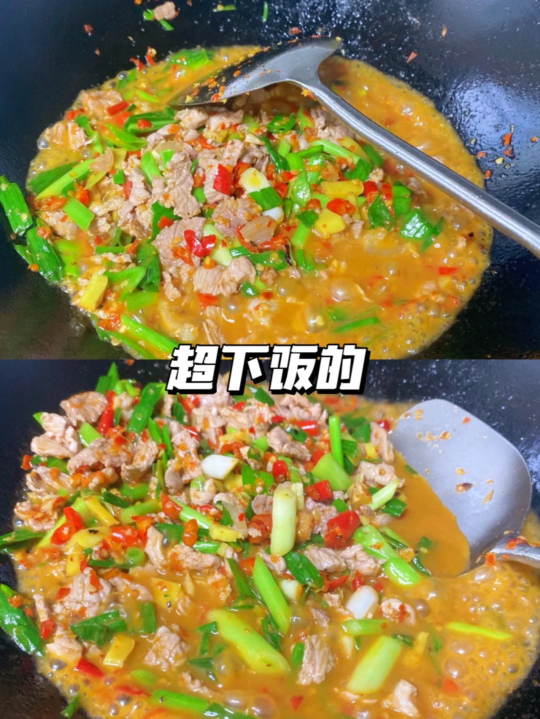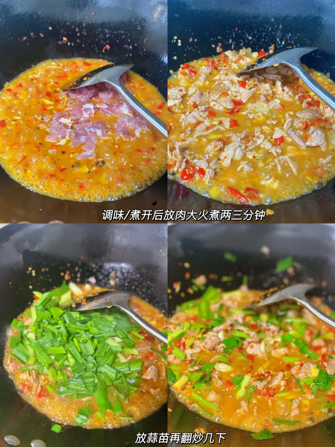 ✨食材:猪肉 蒜苗 姜蒜 小米椒 辣椒粉 1⃣️:猪肉切薄片,肥肉跟瘦肉分开。姜蒜小米椒切碎,蒜苗也斜刀切好备用。 2⃣️:瘦肉可以先加点生粉 胡椒粉 食用油腌制一会。 锅烧热倒油,放入肥肉炒至卷起,放入姜蒜小米椒炒香,再放一大勺辣椒粉转小火炒香。 3⃣️:加一小碗水,两勺🥄生抽 一勺蚝油,一滴酱油大火煮开。煮开后放入瘦肉大火煮两三分钟,再放一点鸡精。放入蒜苗再翻炒几下就可以啦~ 起锅前自己尝尝味道够不够 不够再加点盐🧂 记得多煮点饭~买肉的时候可以买前腿肉 好好吃饭呀🤘🏻