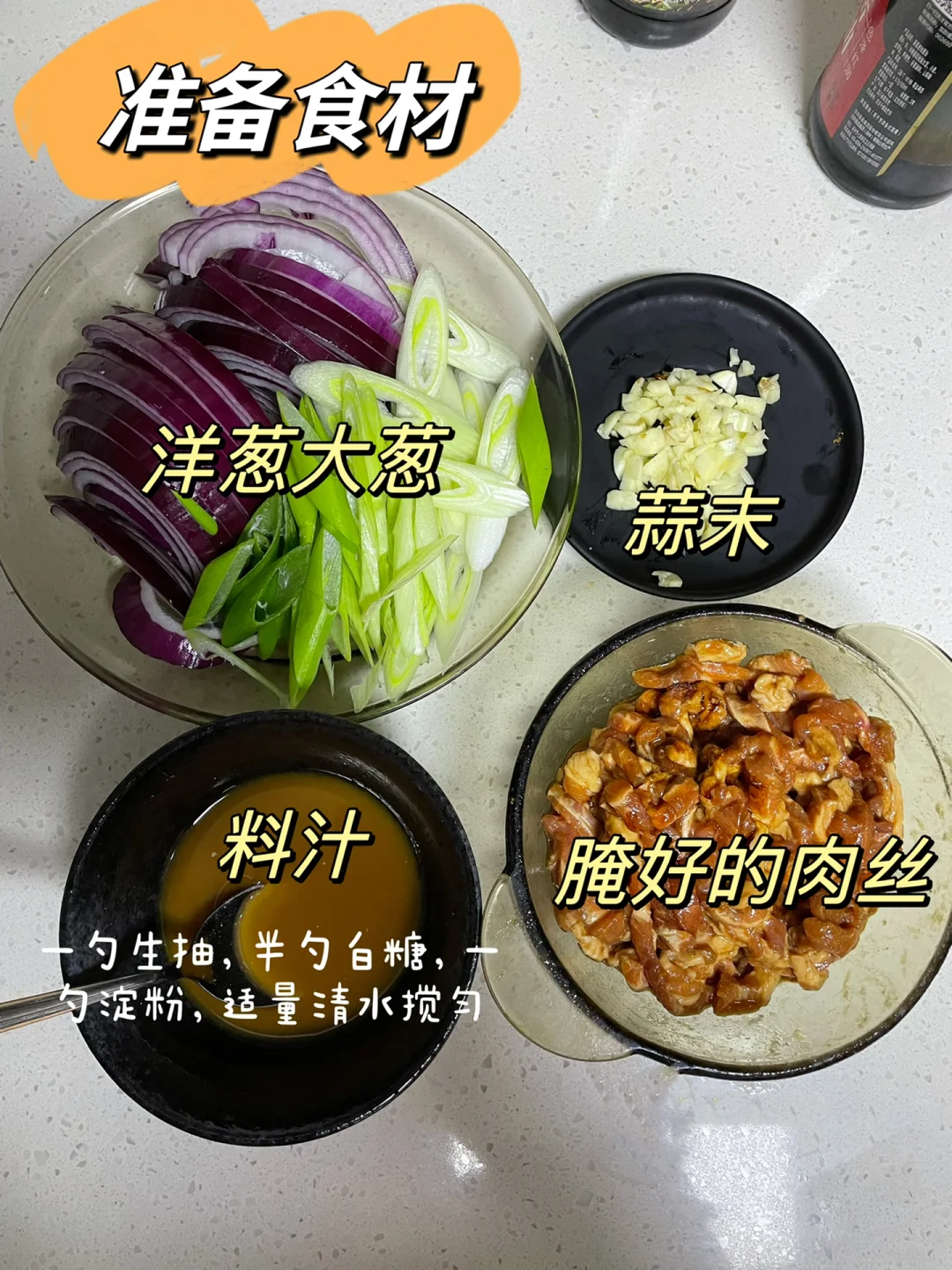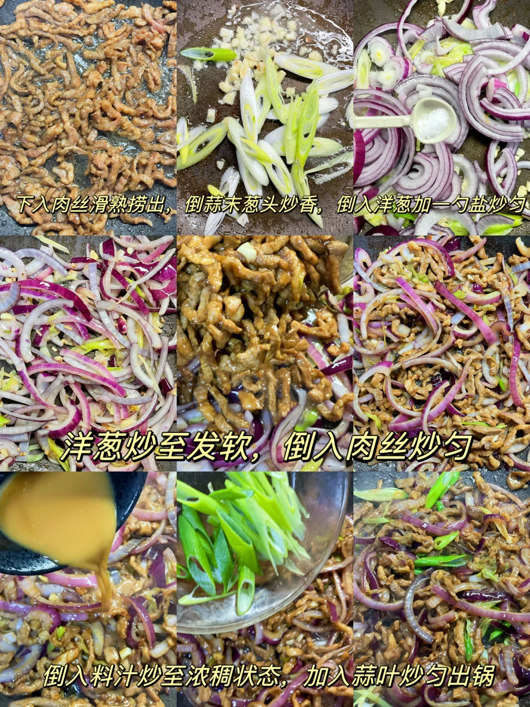 不知道从什么时候开始洋葱炒肉丝也成了我家常做的家常菜了,洋葱清甜可口,肉丝无敌嫩滑,还特别香☺️☺️ 🍀🍀🍀食材:梅花肉,洋葱,大蒜,大葱 1⃣️:洋葱切丝,大葱斜着切片,大蒜切末,梅花肉切丝腌制二十分钟 2⃣️:准备料汁,一勺生抽,半勺白糖,一勺淀粉,适量清水搅匀 3⃣️:锅中油热下入肉丝滑熟捞出,留底油下葱头蒜末炒香,倒入香葱,加一勺盐炒至发软,倒入肉丝炒匀,再倒入料汁炒至浓稠状态,最后倒入葱叶炒匀出锅