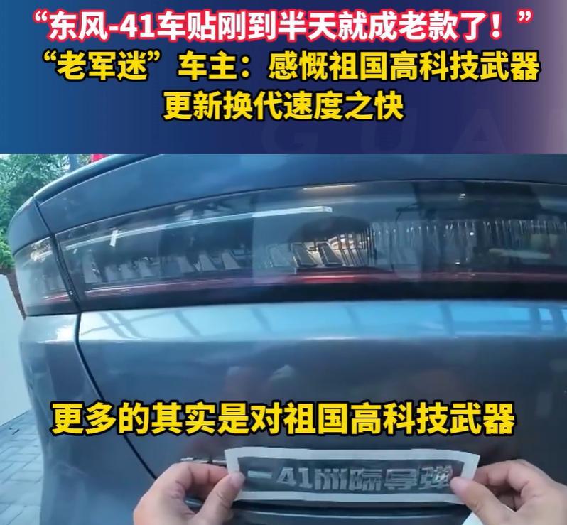 笑不活了!北京,男子是一个老军迷,九三大阅兵之前,他刚买了一个东风41的车贴,不料,还没等贴上去,大阅兵就亮出了东风61,半天之间自己的车贴就成了老款,网友:升级速度比我的手机还快! 男子有一辆东风的新能源车,再加上自己是一个军迷,前不久就在网上购买了一个“41洲际导弹”的车贴,贴在“东风”的后面,就是“东风-41洲际导弹” 没想到,早上刚刚把车贴取回来,还没等贴到车上,阅兵时就亮出了东风61,甚至和自己的车贴之间还隔了一个型号,他看到后也是哭笑不得 说实话,作为一个军迷,我相信李先生对于这种到手即过期是高兴的,完全就是甜蜜的烦恼 而且这次阅兵,给我们带来惊喜的不只是东风-61,许多过去熟悉的装备都有了升级版 曾经的“航母杀手”东风-21D已经被更先进的东风-26D取代,射程更远、毁伤能力更强、突防速度更快。99A主战坦克这次升级为了99B主战坦克,在防御、火力与自动化程度方面都有提升 就连歼-10C这样战斗机,在2025年的阅兵式上也只获得了“表演机”的角色,在后面拉彩烟,当起了“啦啦队” 我相信,对于任何一个军迷来说,这都是最喜欢看到的 #军迷东风41车贴刚到半天就成老款了#