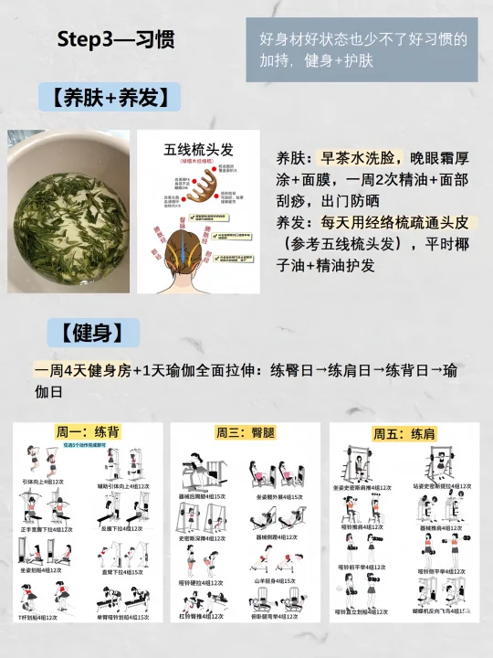 |健身:一周4天健身房+1天瑜伽全面拉伸:练臀日→练肩日→练背日→瑜伽日(具体见图)