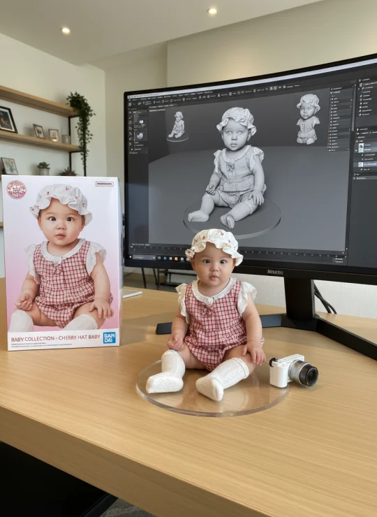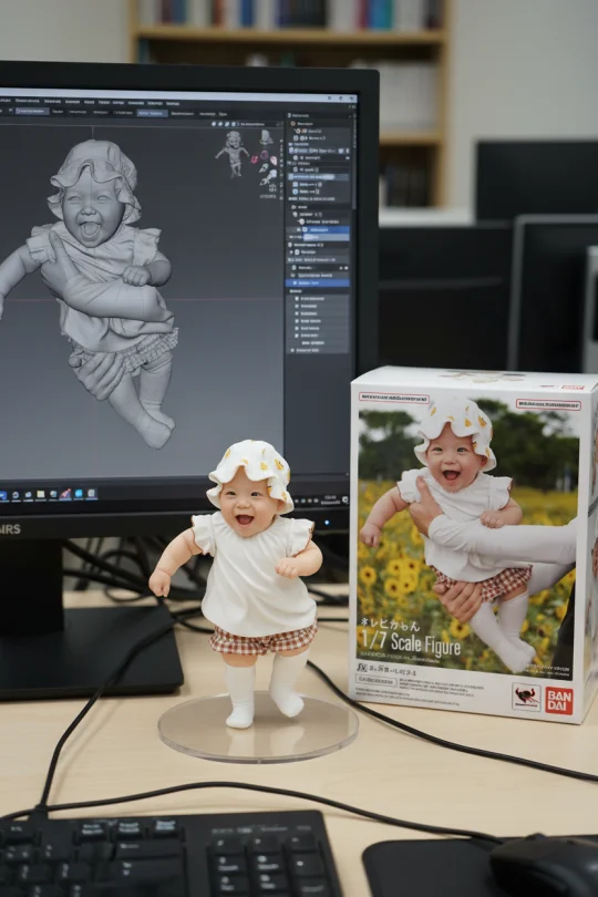Use the nano-banana model to create a 1/7 scale commercialized figure of thecharacter in the illustration, in a realistic styie and environment. Place the figure on a computer desk, using a circular transparent acrylic base without any text.On the computer screen, display the ZBrush modeling process of the figure.Next to the computer screen, place a BANDAl-style toy packaging box printed with the original artwork.