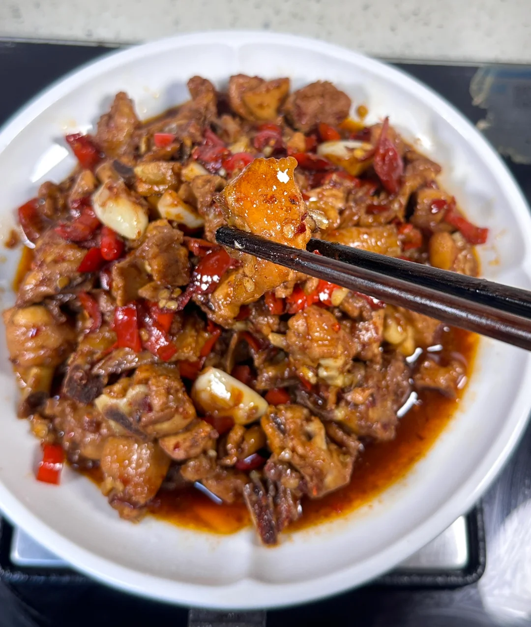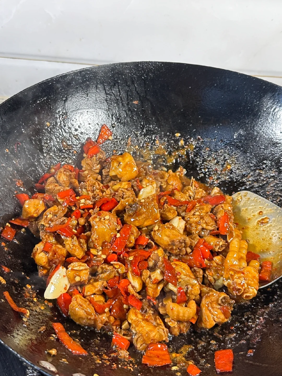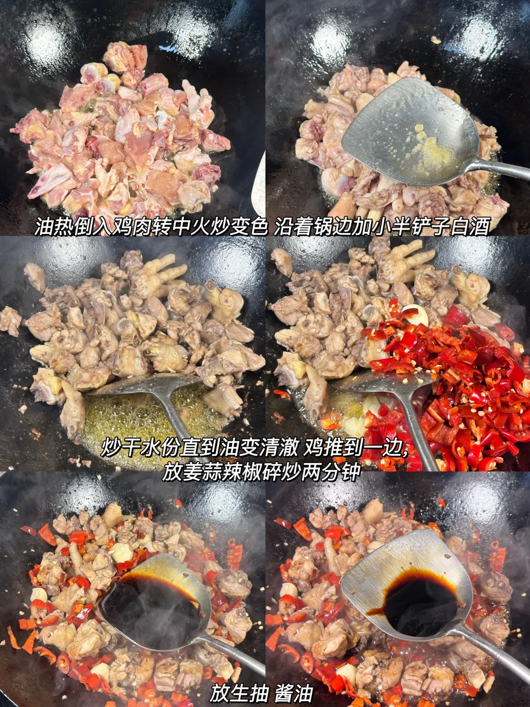 2️⃣:锅里倒油烧热放鸡,转中火炒变色,沿着锅边来小半锅铲白酒增香,一直保持中火炒到油变清澈。再把鸡肉推到一边,放姜蒜粒 红椒 小米椒炒几下,转大火继续翻炒两分钟 。调味刚一铲生抽 小小半铲酱油炒出酱香味。
