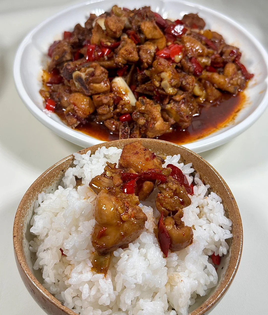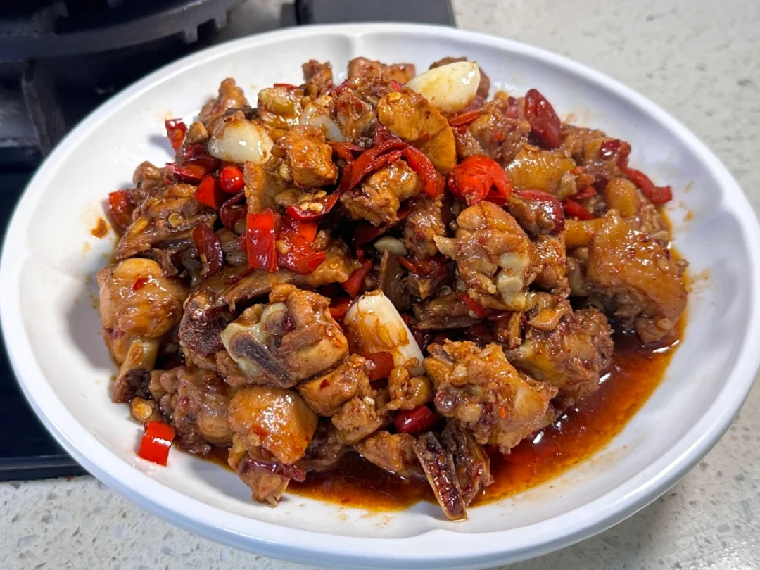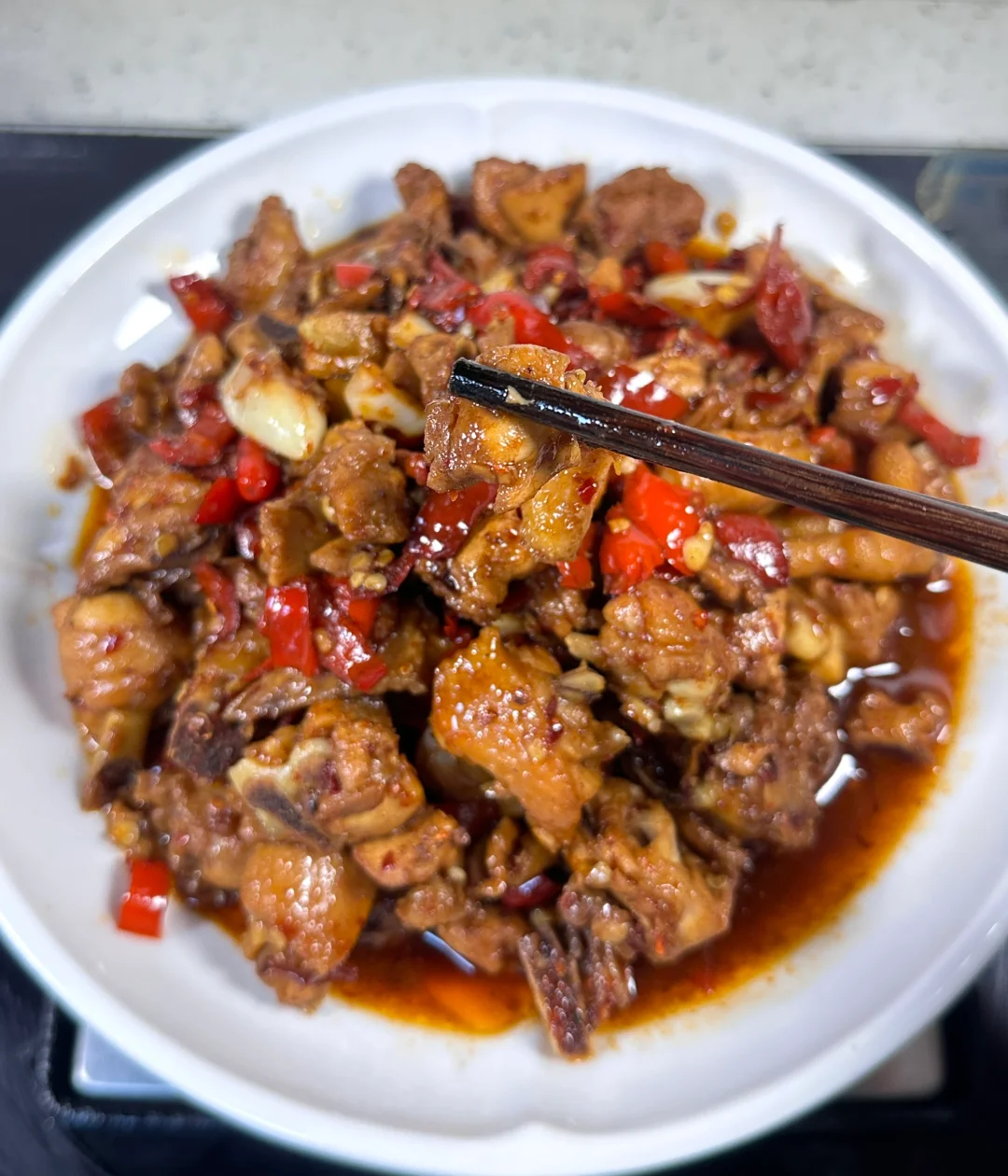 2️⃣:锅里倒油烧热放鸡,转中火炒变色,沿着锅边来小半锅铲白酒增香,一直保持中火炒到油变清澈。再把鸡肉推到一边,放姜蒜粒 红椒 小米椒炒几下,转大火继续翻炒两分钟 。调味刚一铲生抽 小小半铲酱油炒出酱香味。