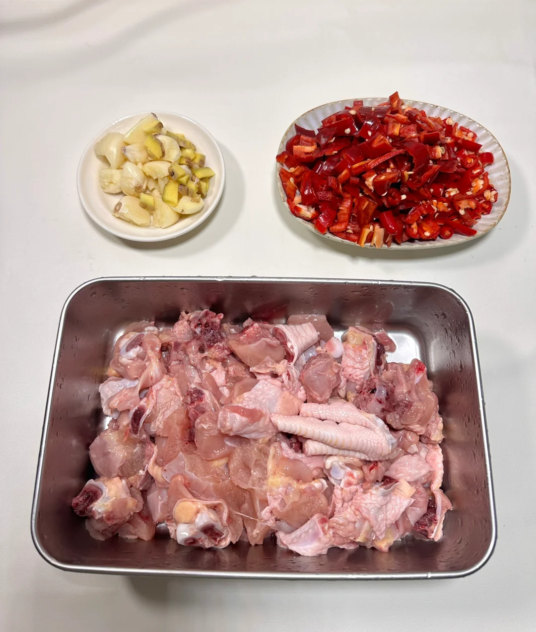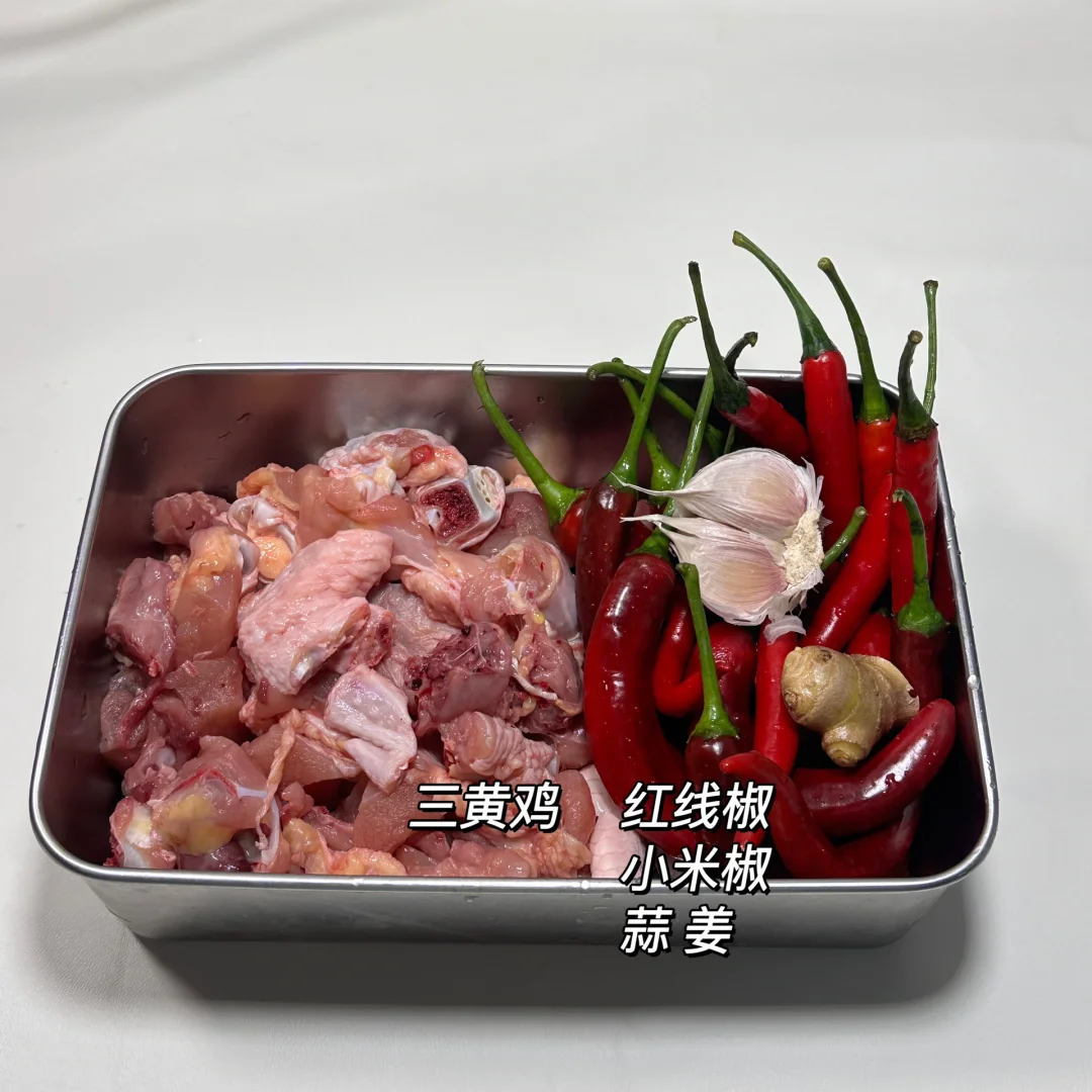 ✨食材:三黄鸡半只(一斤多一点)红线椒 小米椒 姜 蒜(蒜粒多准备点 我这放了一头半)