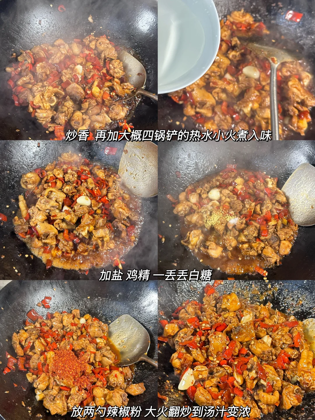 3️⃣:加入大概四锅铲的热水,转小火焖煮一会(不需要盖盖)中途加盐 鸡精 一丢丢白糖提鲜,红椒不辣的。我又加了两勺辣椒粉增香加辣~开大火翻炒几下,汤汁变浓稠~菜色也会很好看[doge]