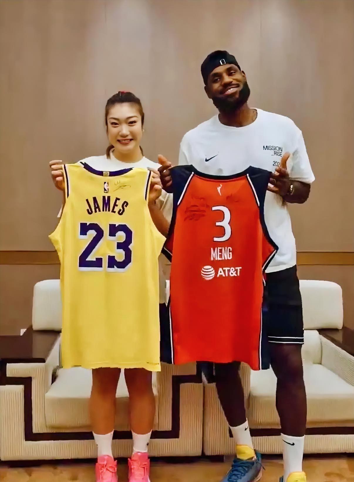 李梦又上热搜了 不是她个人的生活 也不是她无缘国家队,而是 她这次真的圆梦了! 这次詹姆斯中国行活动,李梦可以说是最大的受益者。 她不但送给了詹姆斯和他女儿各送了一个熊猫玩偶,还得到了詹姆斯送给她的一件签名短袖和亲笔签名球鞋。 两人还互换了球衣,李梦得到了詹姆斯湖人球衣,詹姆斯得到了李梦以前在WNBA打球的3号球衣。 李梦这回真的是圆梦了,太让人羡慕了,普通球迷能在外面远远看一眼詹姆斯就很幸运了,李梦能1对1零距离见到詹姆斯,还能得到偶像亲笔签名的礼物,还能合影留念…… 李梦就是这次詹姆斯中国行最大的赢家,大家觉得呢? #詹姆斯# #李梦# #NBA吐槽大会#