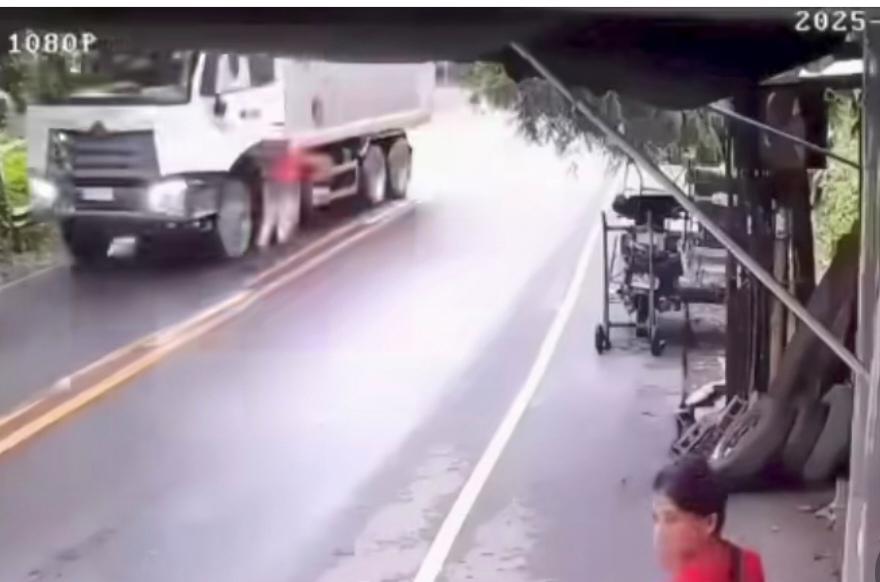 在一个县道转弯处,一辆货车一路鸣着喇叭疾速驶来,经过街边轮胎店时,突然车门打开,驾驶员从货车上跳了下来,驾驶员落地时仰面摔倒,差点就被自己车子后轮压到,场面惊心动魄,驾驶员跳下来摔在地上,赶紧往路边翻了一个身,坐起来看着自己车跑的方向,只听见前面一声巨响,无人货车终于撞到路边障碍物停下了。