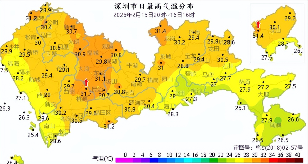 据“深圳天气”消息,根据深圳福田国家基本气象站监测数据显示:2026年除夕(2月16日)最高气温达到29.2℃,较深圳常年除夕平均最高气温偏高9.3℃,打破了2019年除夕(2月4日)创下的28.1℃历史同期最高纪录,成为新的历史极值!(数据统计截至时间:2026年2月16日15时)