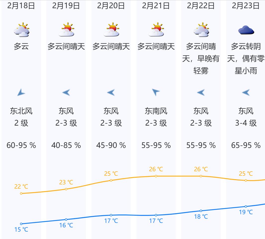 18日(初二)多云,日温差加大,气温15-22℃; 19-22日(初三至初六)多云间晴天,气温逐日回升,白天趋于温暖,早晚清凉; 23日(初七)多云,偶有零星小雨,早晚有轻雾或雾。