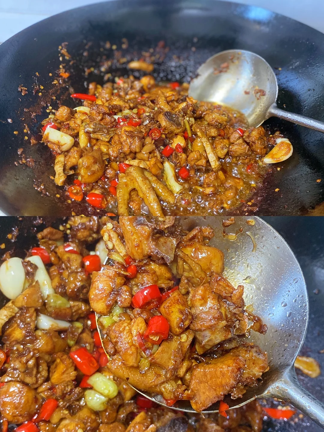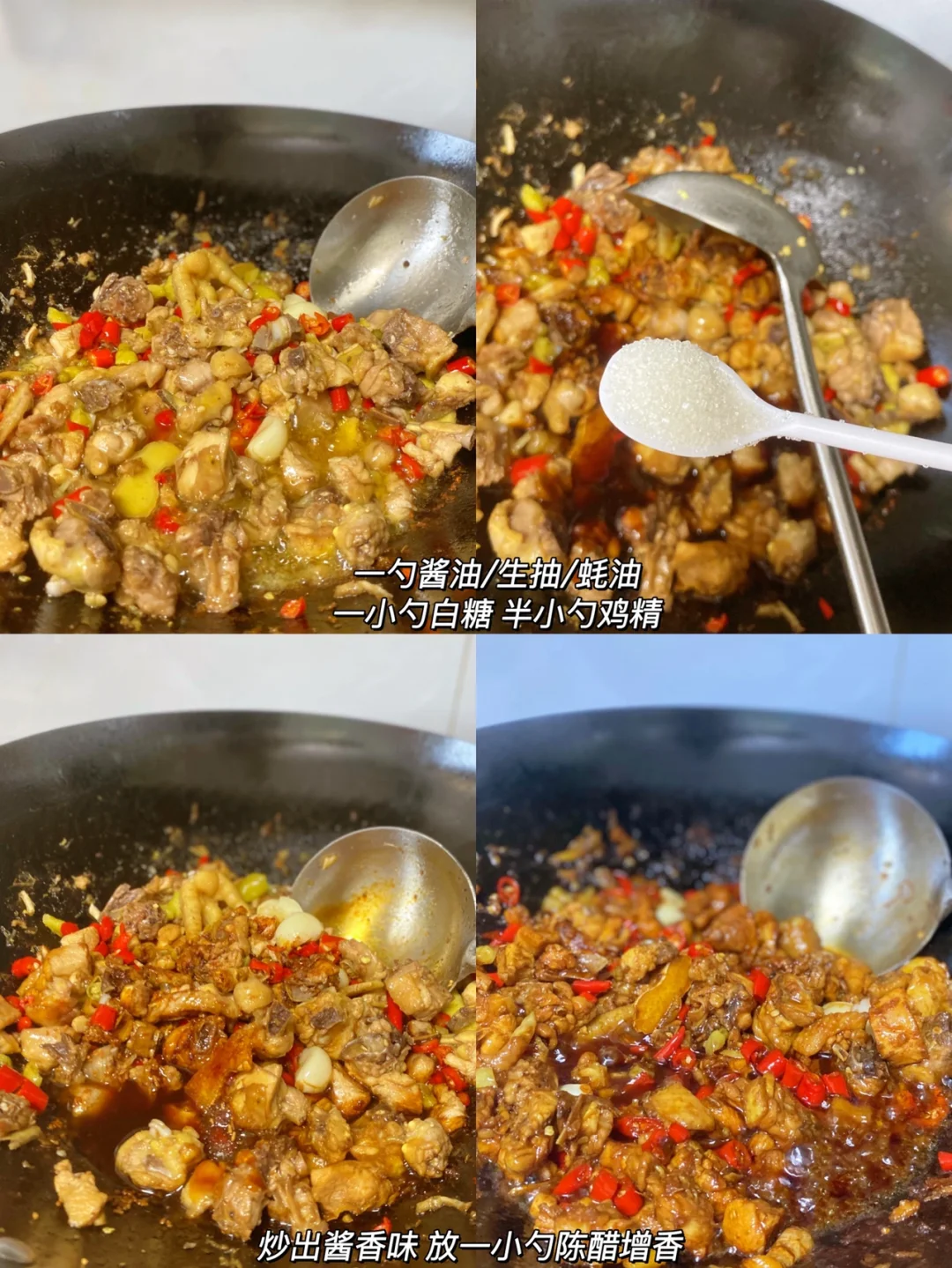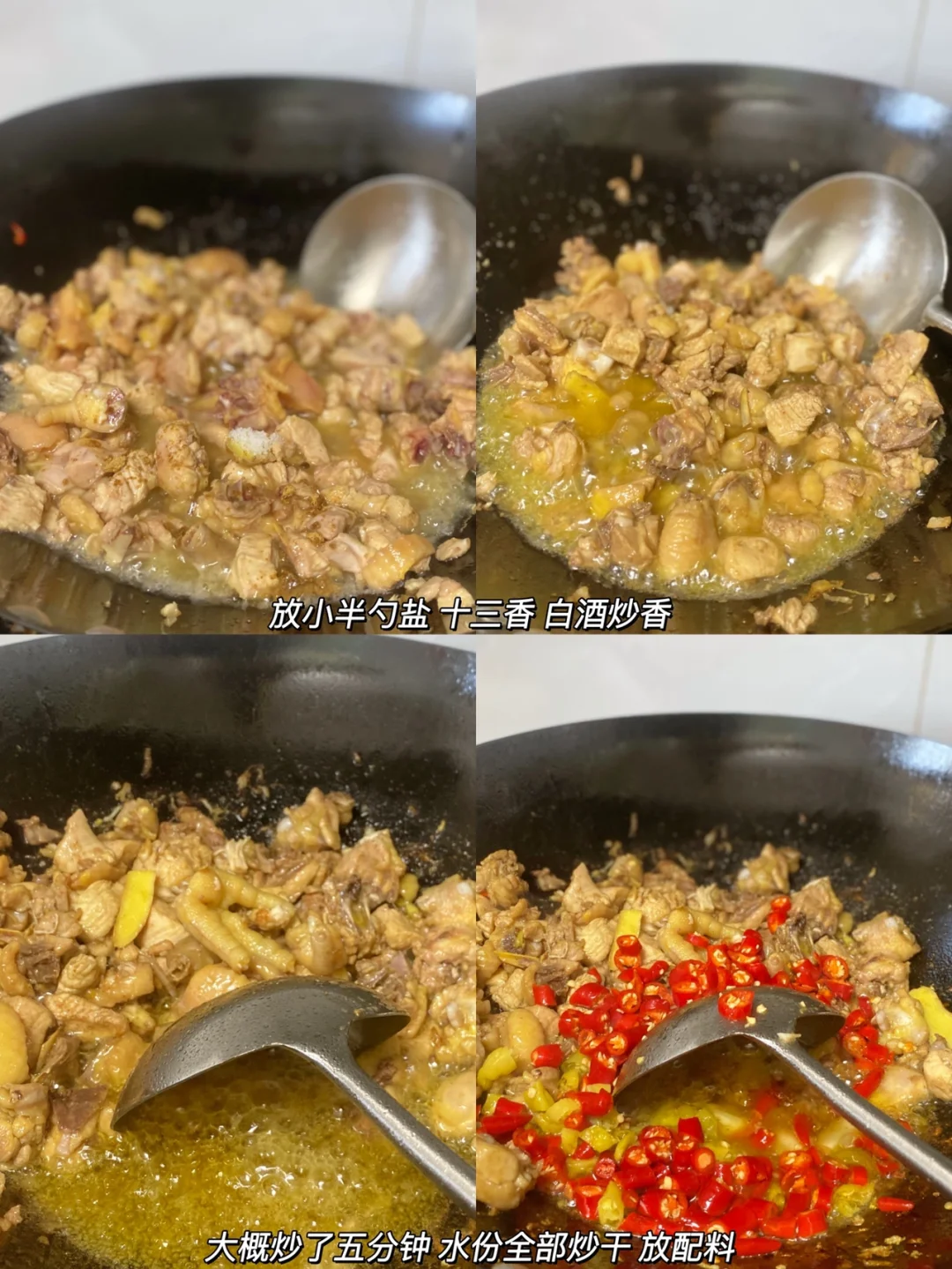 2⃣️:锅里倒比平时炒菜多一点的油 热锅冷油哈 下姜片炒香,倒入鸡肉翻炒变色 沿着锅边倒一勺白酒 ,小半勺十三香/盐继续翻炒匀。转中火炒个大概五分钟 炒干水份。放姜蒜辣椒炒香。