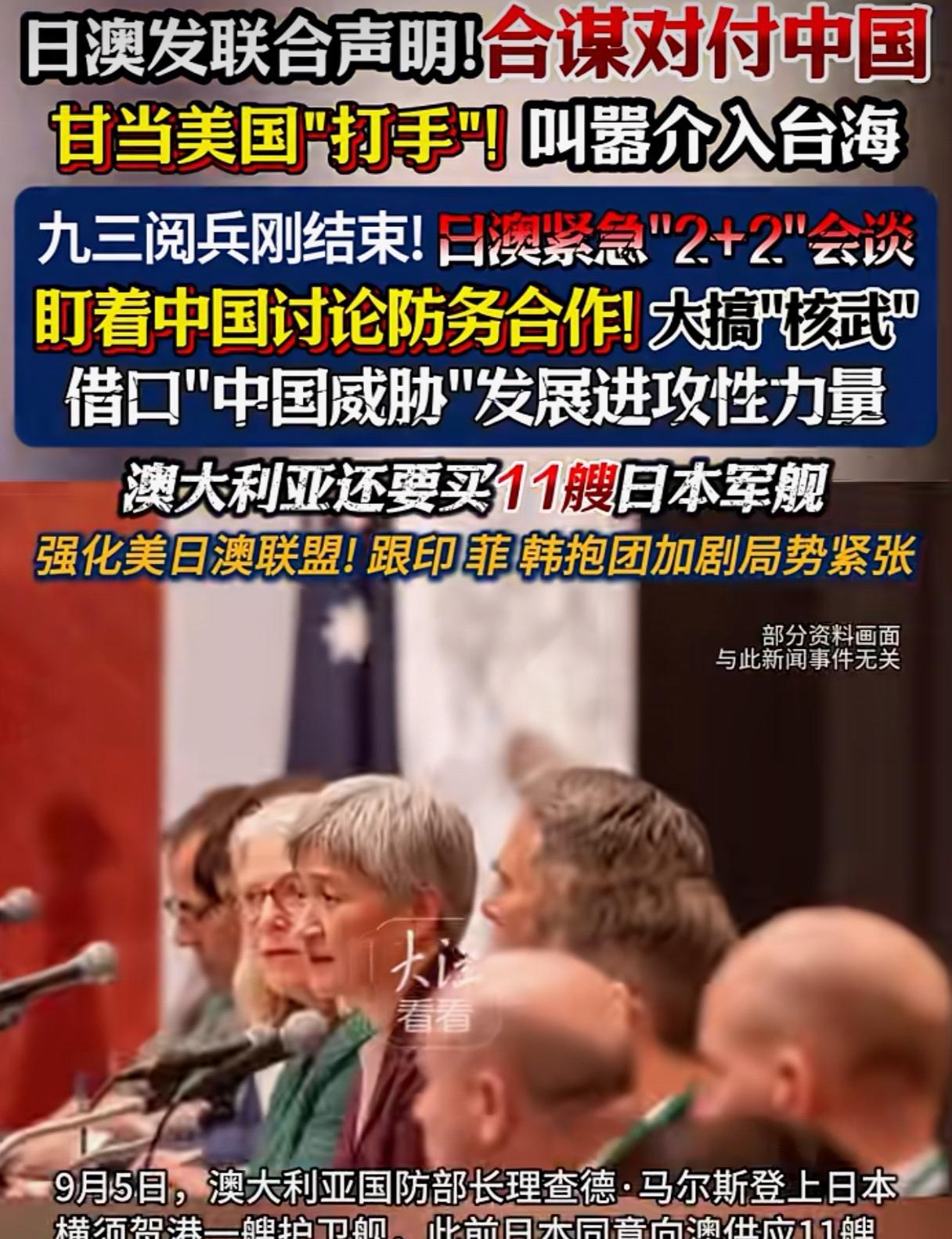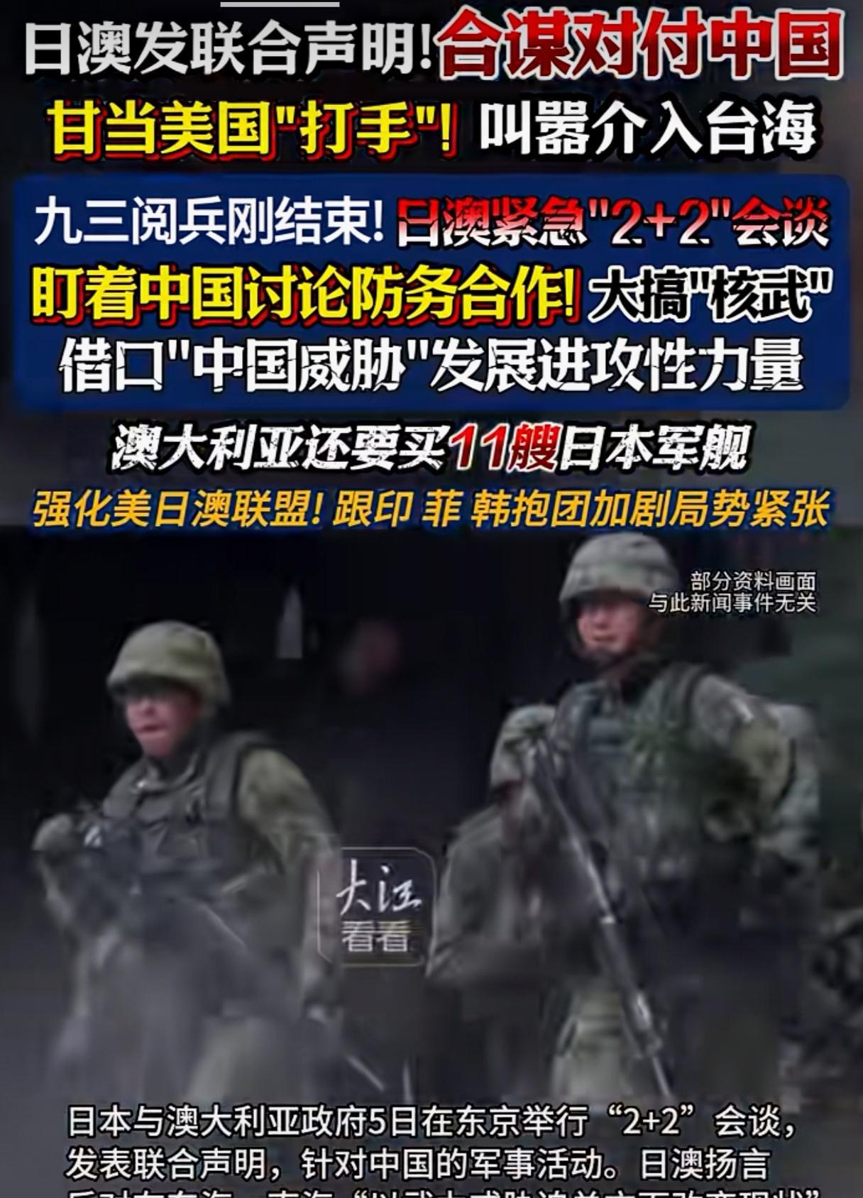 日澳这俩可真是美国的“忠实打手”。在东京的“2+2”会谈上,发表联合声明合谋对付中国。它们借口“中国威胁”,扬言反对在东海、南海“以武力或胁迫单方面改变现状”,还宣称台海和平稳定重要,实则是在挑事。 澳大利亚还打算引进日本最上级护卫舰,计划2029年引入,2026年签合同,部分在日本造,部分在澳洲造。它们妄图强化军事合作,推进所谓“联合威慑力”,还想拉上美、印等国协作。这完全是加剧地区紧张局势,甘当美国遏制中国的“马前卒”,它们的阴谋注定不会得逞!