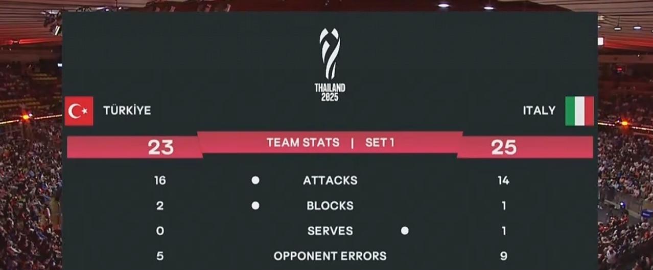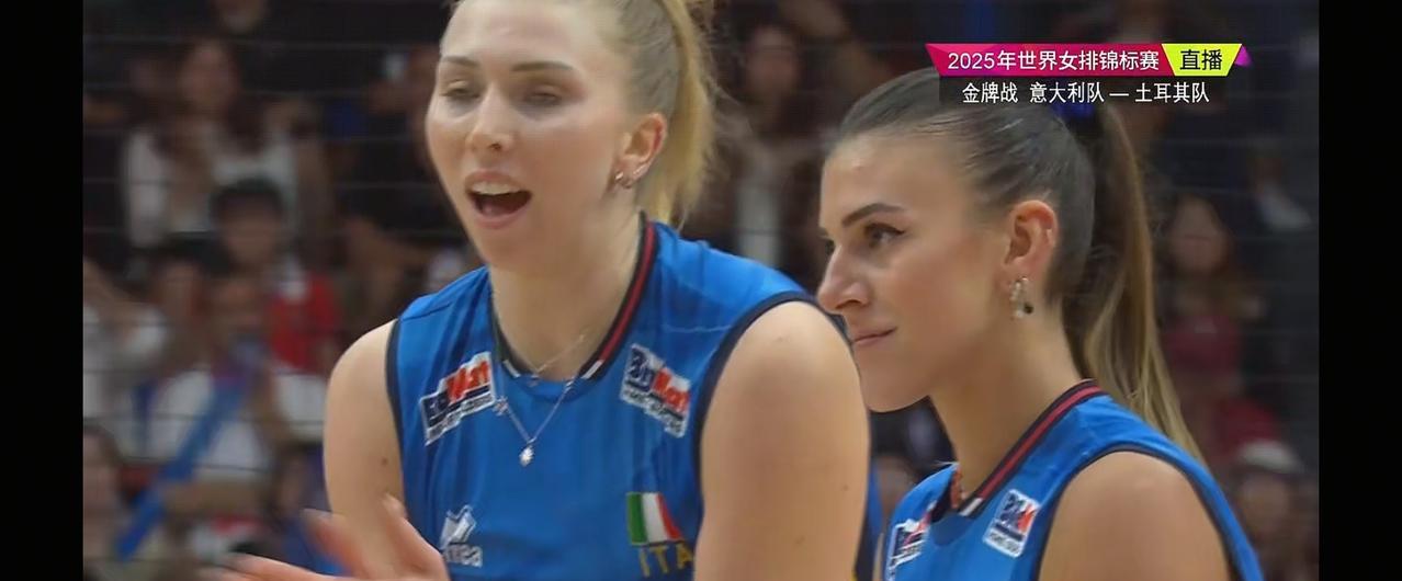 世锦赛金牌战,意大利女排第一局25-23胜土耳其女排。 第一局开局5-5平后,双
