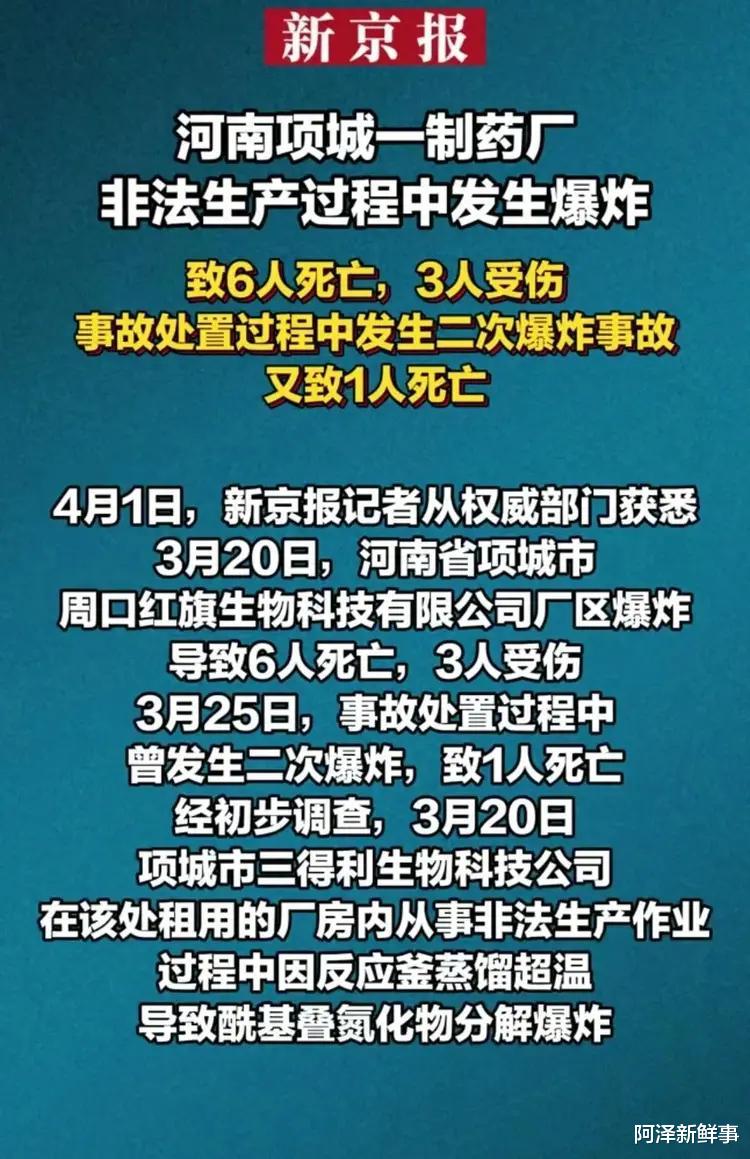 3月20日河南省项城市周口红旗生物科技有限公司厂区发生爆炸,6人当场死亡3人受伤。5天后事故处置现场二次爆炸,一名挖掘机司机死亡。