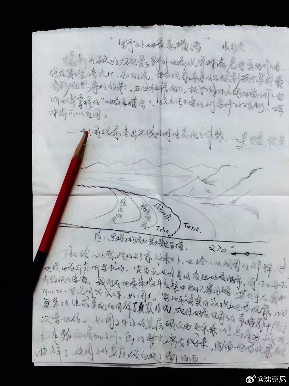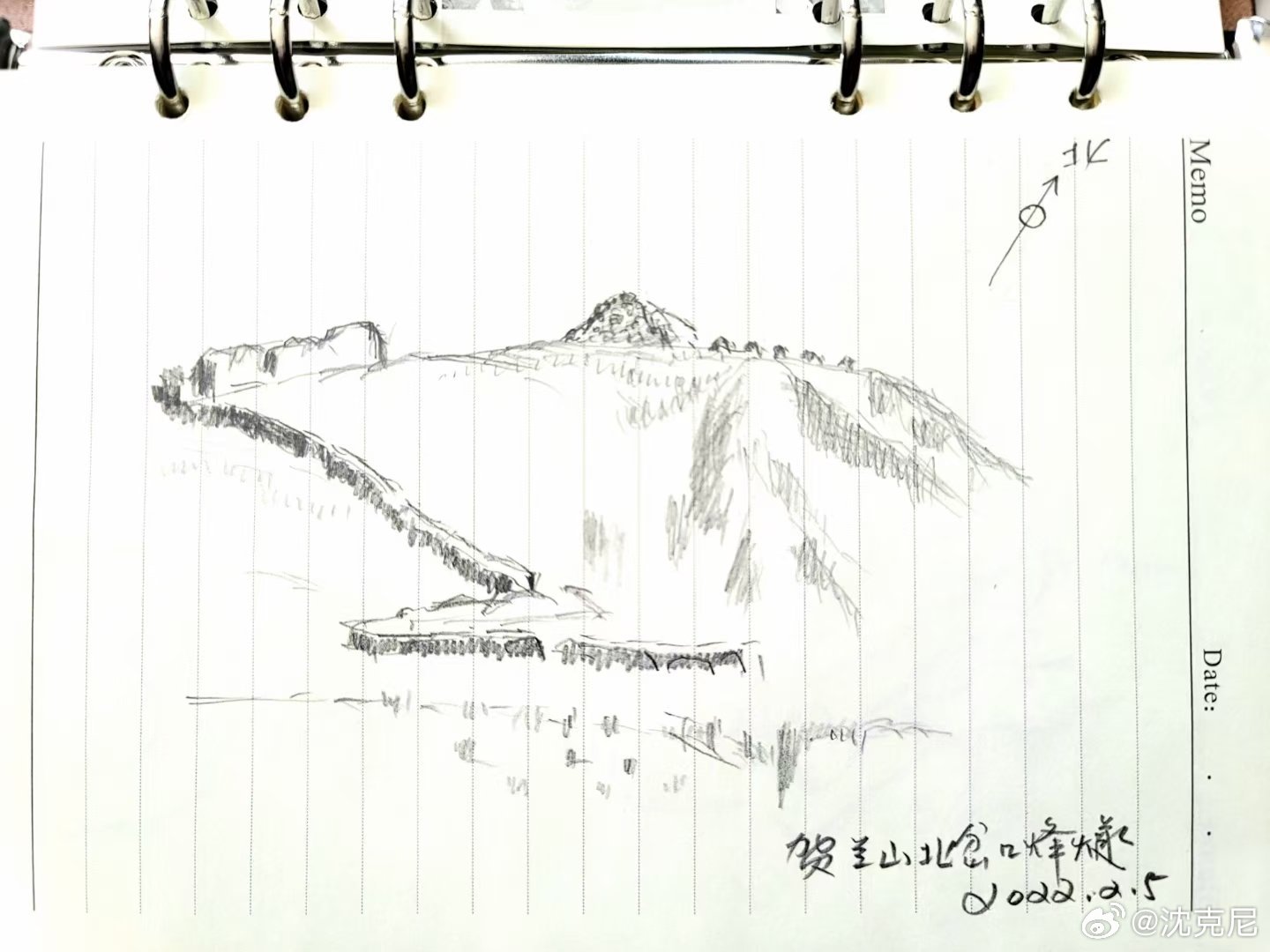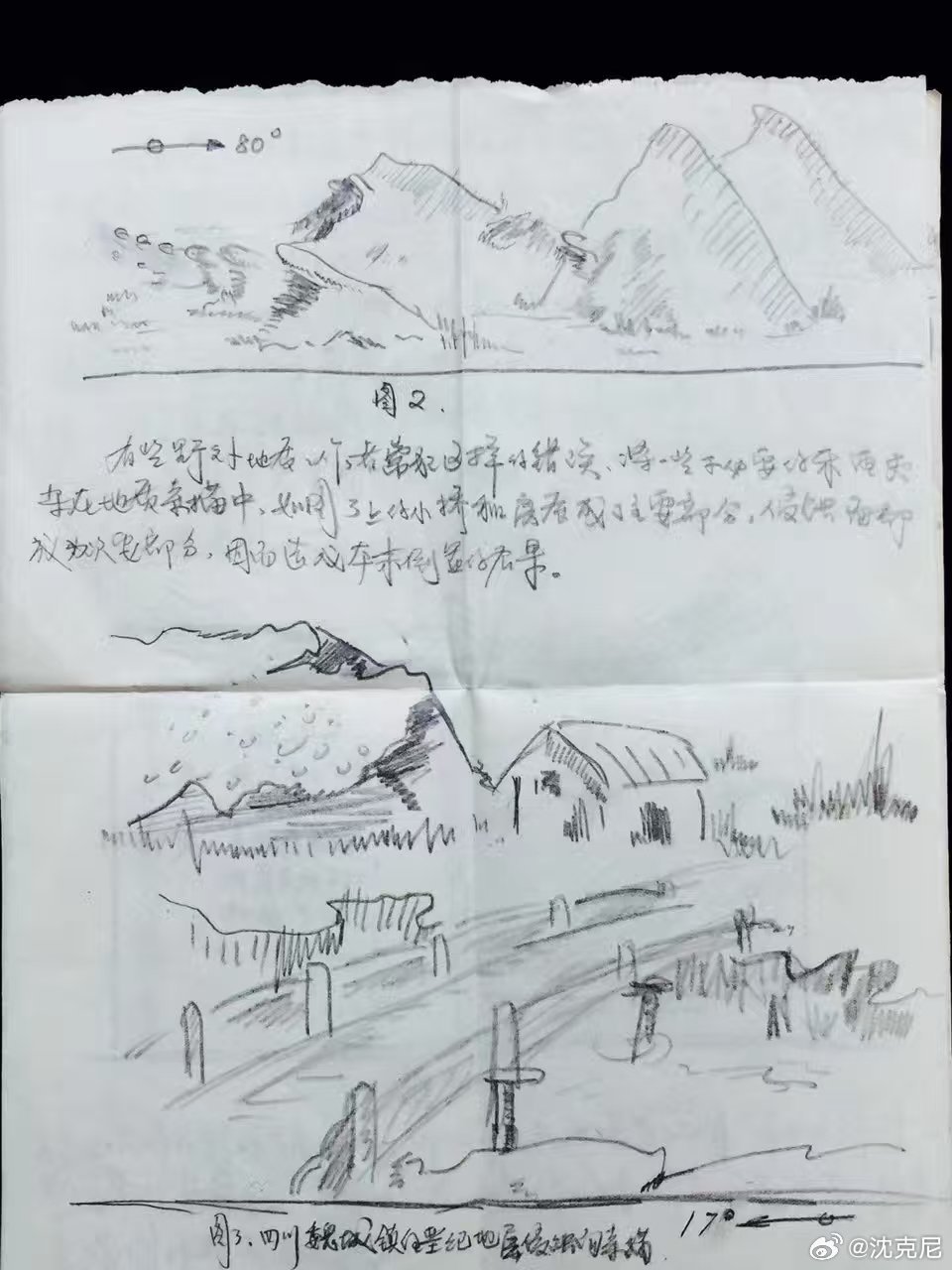 我寻出在宁夏海原下乡当知青时抄写的地质素描笔记(图3-4),当年地质素描的知识,奠定了我日后西藏雅鲁藏布江大拐弯考察和贺兰山古代筑城遗址地形素描的基础(图6)。我回赠占武这位地质学家一把日本手工制作的地质锤,投桃报李。