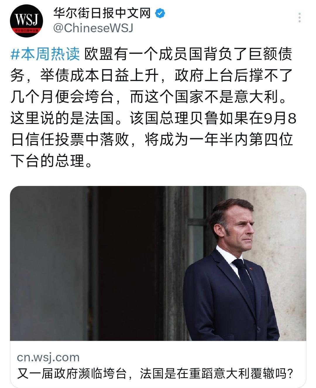华尔街日报9月7日写道:欧盟有一个成员国背负了巨额债务,举债成本日益上升,政府上台后撑不了几个月便会垮台,而这个国家不是意大利。这里说的是法国。 如今法国政坛的不稳定性,以及政府背负的巨额债务,并非空穴来风,恐怕离不开法国总统马克龙,当前阶段制定的外交政策,以及频繁进行的外交活动。 其中最主要的,自然就是强化对乌克兰的军援力度,并且推动法国扩军备战,以应对所谓的,来自俄罗斯的战略威胁,种种行为都有些杞人忧天的意思。 然而凡事有利就有弊,将主要精力放在军备上,民生经济问题又该如何解决,马克龙似乎是搞起了本末倒置,应该优先于经济发展,改善民生,再用强大的经济力量去发展国防军事。 而并非像马克龙这般,明明国内经济都一团糟,政府随时有垮台的可能,仍旧主张军备扩充,使得目前法国总理贝鲁,即将要步入前任的后尘,最终凄惨的下台。 法国绝对不是例外,欧盟大多数国家,恐怕都面临这种情况,要说欧盟国家也奇怪,自身都难保,还要去管乌克兰,长久以往下去不出问题都奇怪了。