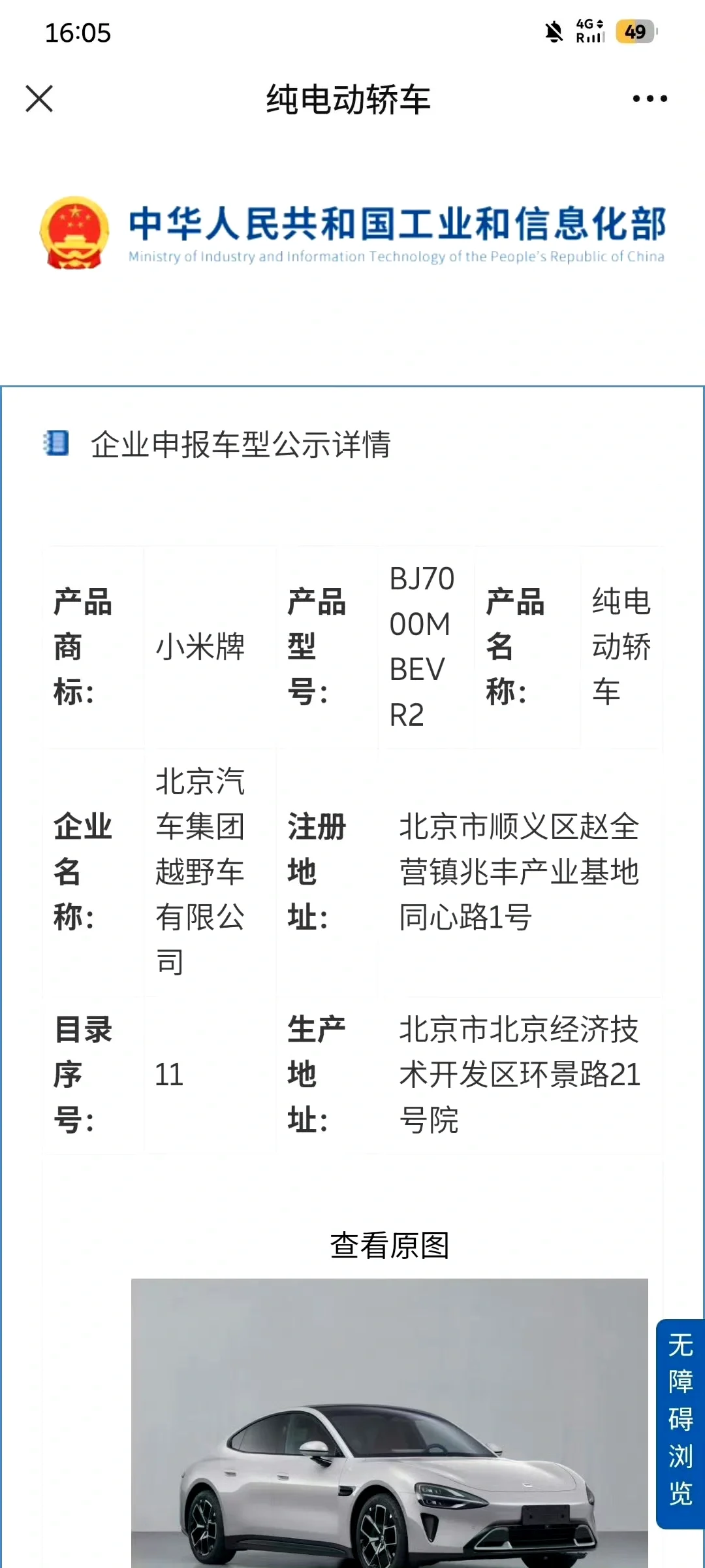 工信部“小米牌纯电动轿车”的企业名称是“北京汽车集团越野车有限公司”,即北京汽车的母公司:北汽集团,的100%持股的子公司。