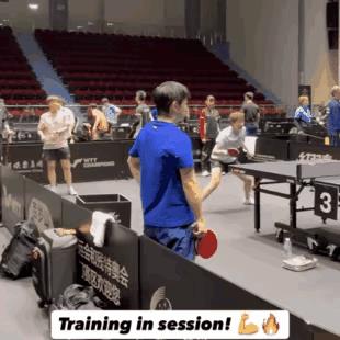 看海产姐妹, 这是澳门冠军赛目前为止最好玩的照片了! 一个疼的龇牙咧嘴,一个笑得一脸开心。 还有轮不上球桌,在排队等待的莎莎。 莎莎练球打着自己小手手了,用球拍捂着嘴,疼的龇牙咧嘴的。 王曼昱很享受晚宴,一边吃东西的一边回头看演出。一脸享受。 球桌也不够用, 由于比赛还没开始,运动员很多,上午澳门天气不好,国乒不上训,集中到下午,球桌都排不上号了。 莎莎蓝色的小小的一只,在看王曼昱和陈熠上训。