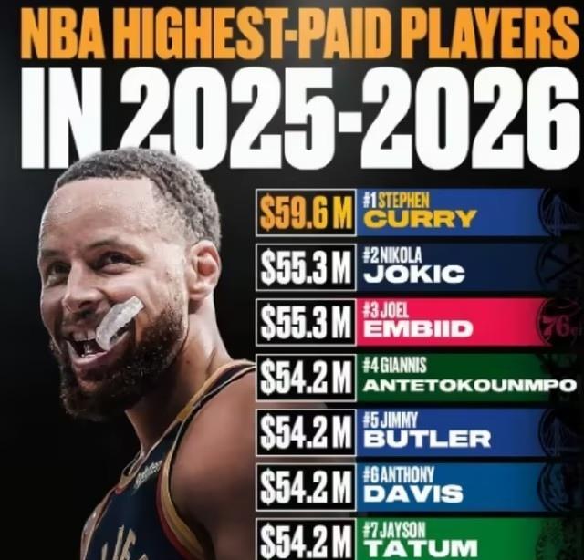 库里:还有谁?老子连续9个赛季薪水联盟第一 据美媒《Hoopsrumors》统计:25-26新赛季NBA球员薪水无人超过6000万美金,且更新了薪水20强名单。其中,库里以5960万6817美金蝉联榜首,且库里连续9个赛季薪水联盟第一创造历史纪录。恩比德与约基奇5522万4526美金并列联盟第二;杜兰特以5328万2608美金排在第8位;詹姆斯5262万7153美金仅排在联盟第12位。值得一提的是,詹姆斯的队友东契奇没有杀进前20。 这是前20名单: 20、贾马尔-穆雷4639万4100美金 19、莫布利4639万4100美金 18、米切尔4639万4100美金 17、马尔卡宁4639万4100美金 16、坎宁安4639万4100美金 15、拉文4749万9660美金 14、莱昂纳德5000万美金 13、乔治5166万6090美金 12、詹姆斯5262万7153美金 11、唐斯5314万2264美金 10、杰伦-布朗5314万2264美金 9、布克5314万2264美金 8、杜兰特5328万2608美金 7、塔图姆5412万6450美金 6、浓眉哥5412万6450美金 5、巴特勒5412万6450美金 4、字母哥5412万6450美金 3、约基奇5522万4526美金 2、恩比德5522万4526美金 1、库里5960万6817美金 自诩“GOAT”的勒布朗-詹姆斯薪水仅仅排在第12位,和他的地位似乎有些不符。然而,詹姆斯,三易球队,堪称“NBA吕布”,却总是签对自己有利的“1+1合同”,薪水当然不可能有很高了。虽然是顶薪合同,但是距超级顶薪还是有差距的。 而库里,从2009年进入联盟至今,已经为勇士效力16载,从未易队,除了新秀合同到期后签了一份童工合同,后面都是签的超级顶薪合同,所以连续9个赛季登顶薪水榜也就不足为奇了。 詹姆斯为了追逐总冠军多次换队;而库里至今一队,夺冠数量却多于詹姆斯,时也命也!不过詹姆斯创造了一个前无古人也极可能后无来者的记录:在三支不同的球队夺冠且拿下FMVP。