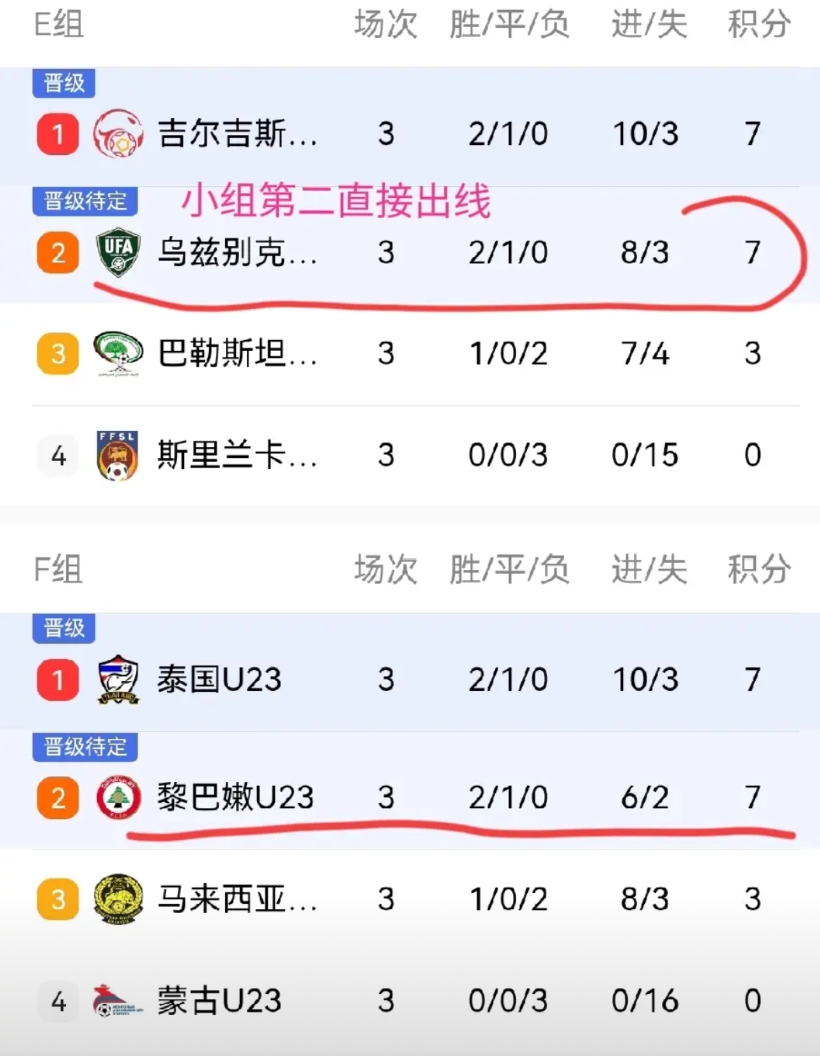 目前各组小组第二成绩E组的乌鸡积分7分,而黎巴嫩也是积分7分,我们如果输球就要和积分6分的对手竞争前四,那么积分6分的阿联酋尽然净胜球来到了14个,是各组中最高的一支球队,他们一定排在第三。