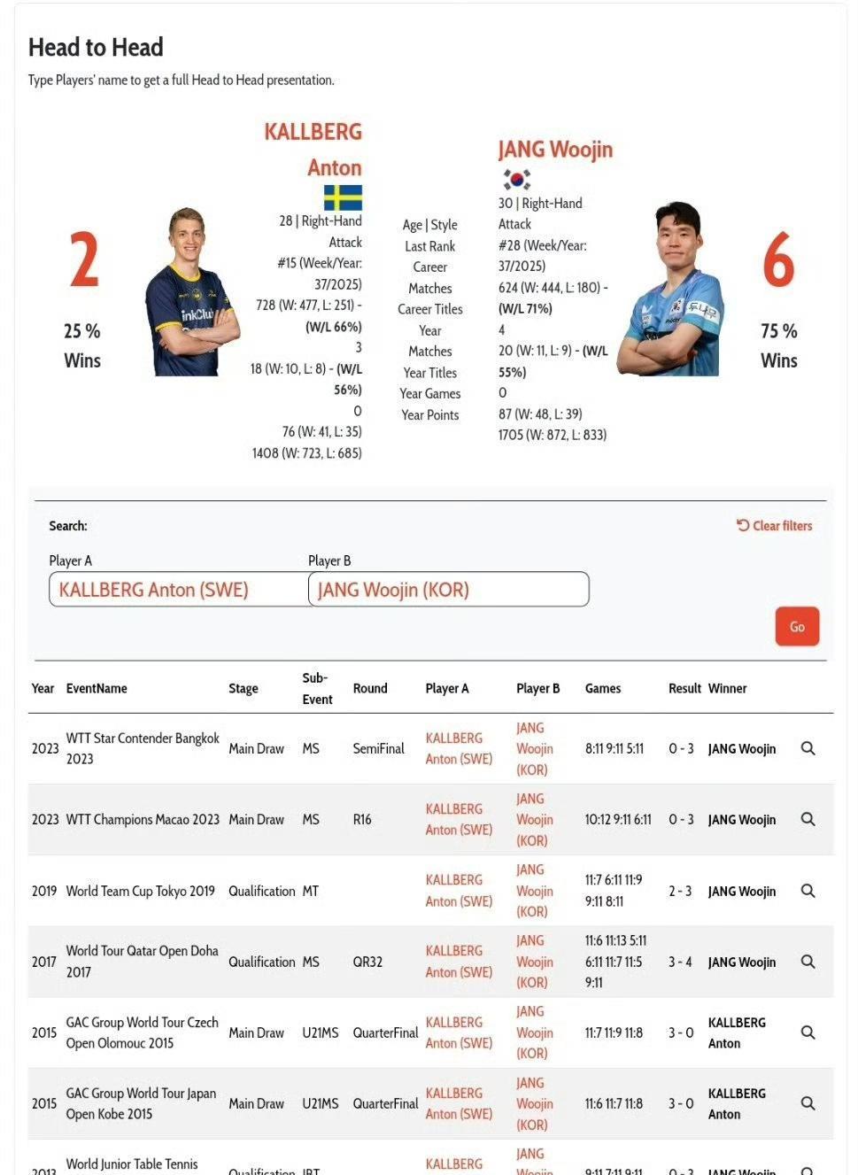2013年国际乒联拉巴特世青赛男单:张禹珍4比2卡尔伯格 2013年国际乒联拉巴特世青赛男团:张禹珍3比0卡尔伯格 2015年国际乒联日本公开赛U21:卡尔伯格3比0张禹珍 2015年国际乒联捷克公开赛U21:卡尔伯格3比0张禹珍 2017年国际乒联卡塔尔公开赛:张禹珍4比3卡尔伯格 2019年国际乒联东京团体世界杯:张禹珍3比2卡尔伯格 2023WTT澳门冠军赛:张禹珍3比0卡尔伯格 2023WTT曼谷球星挑战赛:张禹珍3比0卡尔伯格