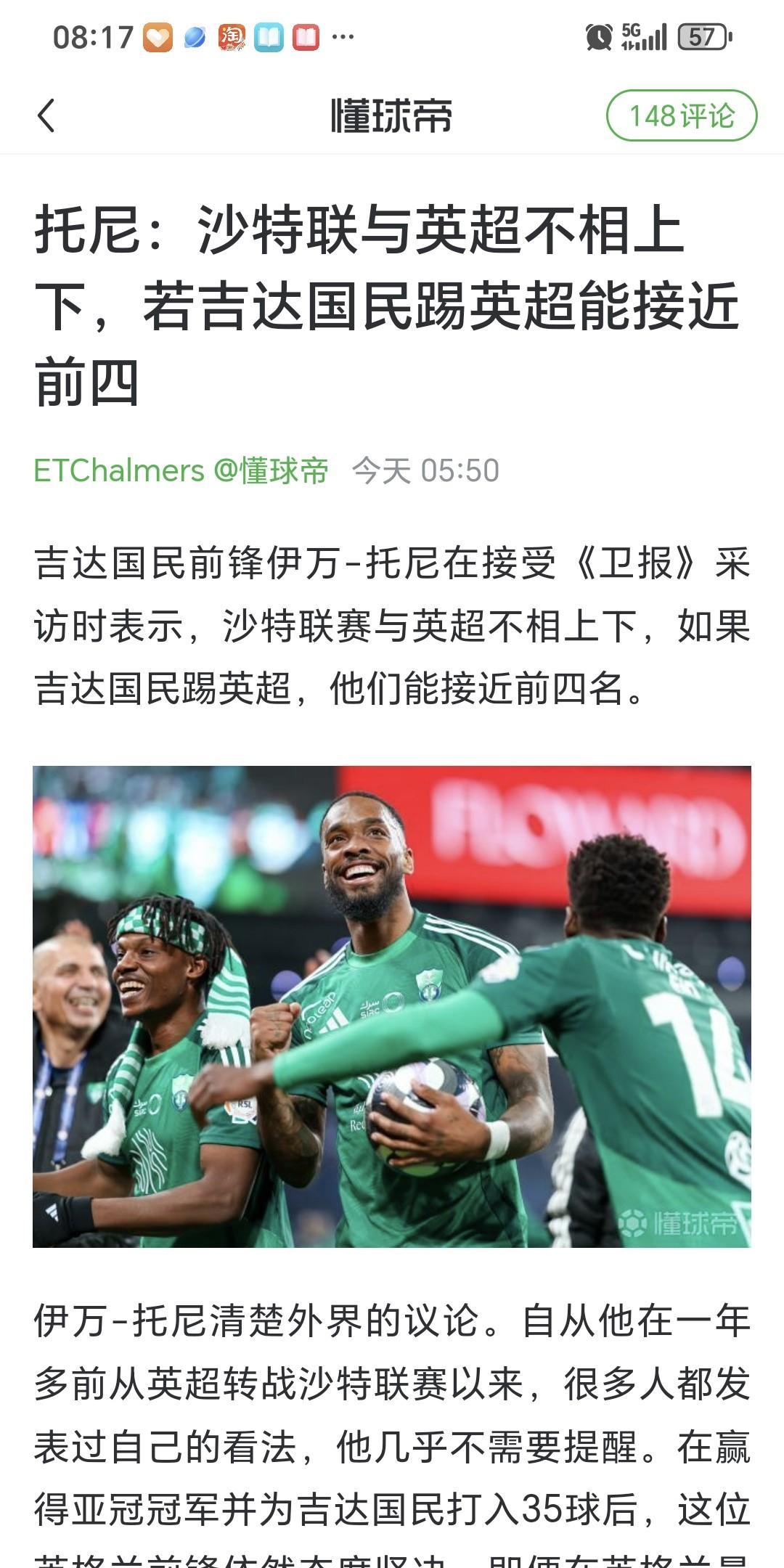 典型的吃人嘴软、拿人手短,居然大言不惭说沙特联赛和英超差不多,这是没有睡醒说胡话了吧!英国前锋伊万-托尼在接受《卫报》采访时大放厥词,托尼表示:沙特联赛和英超水平不相上下,吉达联合去参加英超能拿前四。 其实明眼人都知道,沙特联在亚洲应该算第一联赛,但是顶多算英冠水平,毕竟年纪轻轻去沙特捞金的不多,大部分只是像C罗这样的过气球星。 要怪只能怪曼城,居然在世俱杯上踢不过来自沙特联的利雅得新月,所以给了伊万-托尼错觉,觉得沙特联赛和英超差不多。 说句实在话,如果有老板给我上千万年薪,我也会见人就夸老板。所以说,伊万-托尼挣着高薪,接受采访时夸夸老板也无可厚非。 那么问题来了,您认为沙特联赛是英超水平还是英冠水平?#足球#