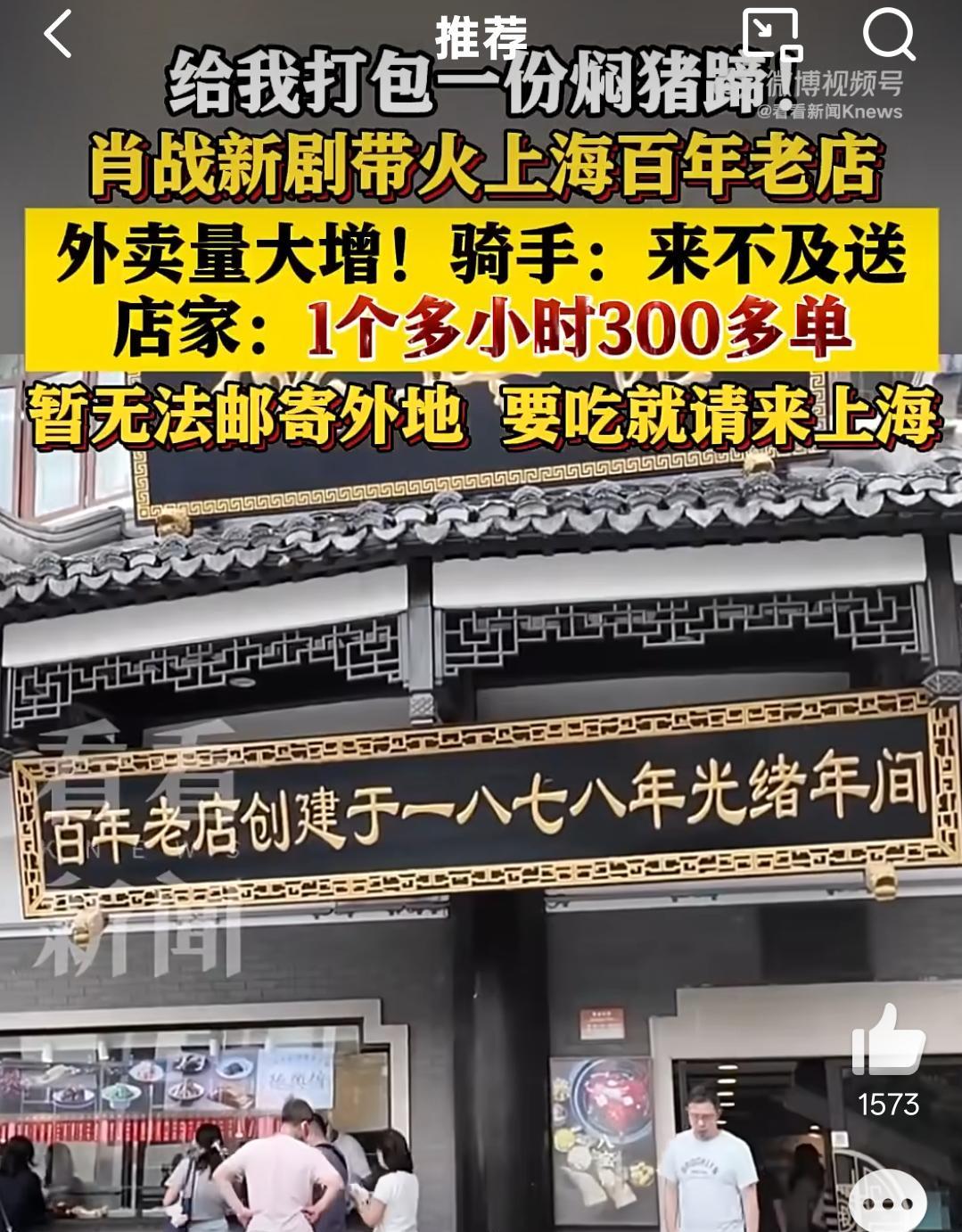 任少白带货比李佳琦狠多了,直接干到供应链崩溃边缘…肖战在谍报上不封顶预告里的一句台词就让德兴馆的焖猪蹄卖爆了,还有记者专门去采访了上海德兴馆,上海德兴面馆副总经理王丰表示,自9月8日起,广东路总店焖蹄销量从平日两三百斤飙升至9日的800多斤,10日备货量达1500多斤! 五倍还拐弯哦,店家表示,从9月8日开始,订单量明显上升,短短一两个小时300多单,外卖小哥也直呼来不及送。但是因为制作工艺,暂无法邮寄外地。哈哈哈不服不行,这就是肖战效应肖战的国民度! 对于爆单,店家王经理也表示始料未及:“并没有投放广告,突然之间预告片里提到我们,然后从周一开始店里很多电话打进来,那天晚上外卖订单激增,打得我们措手不及,师傅都来不及切片,门店销量也出现直线上升,我们也没想到,纯粹属于意外”。 记者昨日前往位于上海广东路的德兴馆总店,发现店门口不少市民在排队购买熟食,还有人在现场直播。 冯先生的桌上有一大盒焖蹄,已经吃了大半,他告诉记者,自己和朋友是因为看到肖战的新剧《谍报上不封顶》出了片花,所以来德兴馆点了同款的焖蹄。冯先生表示,他自己除了是肖战的粉丝,也是德兴馆的老食客。“ 搜索电商平台发现,已有商家开始网上加价25元代购开卖肖战同款焖猪蹄,还分成普通版本和精品版,已有100+订单。店家表示,网上所谓的普通版,估计是代购买的85元一斤焖蹄回去自己切成两份,虽然冷藏的焖猪蹄可以放置半个月以上,但店家还是不建议网友们远程代购,因为会影响口味,容易发生变质的情况! 太牛了我天,肖战真是财神爷,谍报还没播,同款美食倒先爆了。德兴馆,这泼天的富贵你可要接住了!