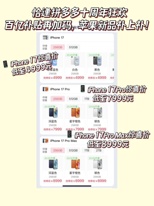 - ✅iPhone17发布会已结束,给大家总结一下17系列有哪些新增变化 ①iPhone17:A19处理器;重要的是直接256GB起售,加量不加价,预算不太充足以及对长焦没什么需求可以直接冲!置摄像头与WiFi 芯片上均有提升!并拥有120Hz刷新率这一点超赞! - ②iPhone Air 轻薄机身+钛金属边框,手感嘎嘎棒,处理器给了Pro同款的A19Pro,一样有120Hz高刷 - ③Phone 17 Pro和Pro Max 新增了VC均热板散热,发烫情况会有缓解! 主要亮点是横向矩阵镜头+铝合金一体机身辨识度十足。后置3摄都升级成了4800万像素,支持8倍光学变焦和40倍数码变焦。 - ✅怎么购买更划算 恰逢拼多多十周年狂欢,百亿补贴再加码,苹果新品补上补! 📱 iPhone 17惊喜价低至4999元,新品开售至高直降1000元! 📱 iPhone 17Pro惊喜价低至7999元,新品开售至高直降1000元! 📱 iPhone 17ProMax惊喜价低至8999元,新品开售至高直降1000元! 补贴力度远超往年,诚意直接拉满! ✨购买方法: 1️⃣ 打开拼多多APP,进入【百亿补贴】频道; 2️⃣ 选择你想购买的新品,领取商品券:用户可在商品详情页查看并点击领取,准点发放,先到先得,至多可减700元; 3️⃣ 领取积分券:用户可在百亿补贴频道右上角点击进入“积分”活动页。可在“限时抢券活动”专区,使用相应的积分兑换“iPhone 17系列新品积分优惠券”,至多可兑换100元; 4️⃣ 到手价=商品券前价-商品无门槛券-积分限时券。下单2025苹果秋季新品,至高直降1000元!
