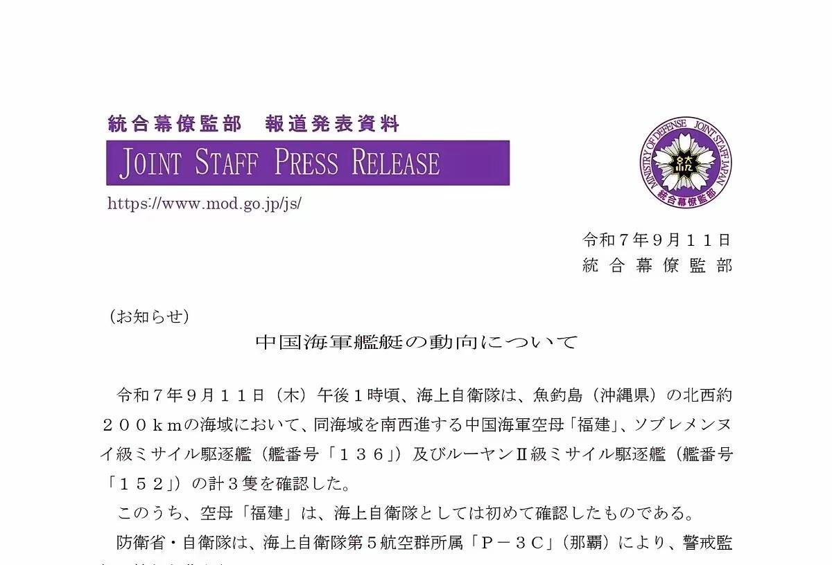 9月11日,日本自卫队首次拍到福建舰航母在两艘驱逐舰护卫下经东海南下。9月10日