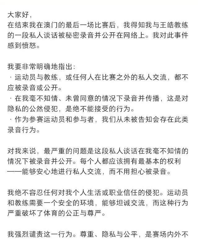 用成绩说话的竞技体育越来越像娱乐节目,像真人秀了,不尊重运动员和教练员的隐私,人与人的生活聊天都被录取发到网上,在场的工作人员还有没有职业道德和修养。 支持邱党追责,让组织方负法律责任,邱党发文他在WTT澳门冠军赛比赛结束后,他和王皓教练的私聊被人录音放到网上,他和王皓教练都不知道。 王皓教练后面还有好几场比赛,这不是故意影响他状态吗?希望组织方承办方给出说法。