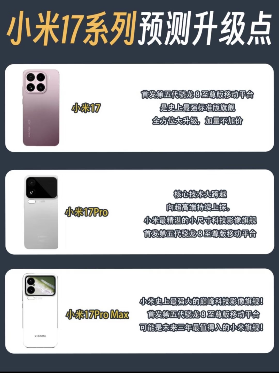 小米跳过“16”直接命名为“17”系列,主要是为了更直接地对标同期发布的苹果iPhone 17系列,小米官方决定跳过 16,让新品直接以小米 17 系列的身份亮相,这也体现了小米在高端市场与苹果竞争的决心。 - 小米集团总裁卢伟冰表示,五年前小米就开启了高端化战略,并坚定对标iPhone。如今选择在同代同级直面iPhone 17系列,是出于对自身产品力的信心。所以今年的可选的手机非常多,iPhone17已经已经很香了,但是小米这次放出来的消息,值得期待!可以再观望一下! - 苹果17虽香,但9月,小米17才是重头戏!据说这次升级堪称「史诗级」,等等或许更值得 小米17消息汇总: 小米 17 系列,包括三款产品:小米 17、小米 17 Pro、小米 17 Pro Max。 小米 17,宣传是是小米史上数一数二的标准版旗舰,全方位大升级,加量不加价。 两款 Pro属于是核心技术大跨越,向超高端持续上探。 小米 17 Pro是超精湛的小尺寸科技影像旗舰; 小米 17 Pro Max更是小米史上巅峰科技影像旗舰! - 手持小米12/13,值得换吗? 如果你的手机已经开始卡顿、续航崩了……别犹豫,17绝对是跨越式升级! 双持党春天也来了? 小米也在加速生态布局、正在高端化,最近开始测试的hyper OS3的流畅度和好玩易用也收获了好评 不仅如此我还听说新系统支持无缝联动Win/Mac/iOS,文件互传、通知同步、生态协作全打通!iPhone+小米双持,可能比想象中更爽…… —————— 所以你是选择苹果的稳定生态,还是等等小米17的极致堆料? 还在观望或者是准备双持的同学,今年9月小米17同样值得期待! 小米17官宣本月发布小米17 数码攻略 手机推荐 苹果vs小米 等等党必胜小米16改名小米17