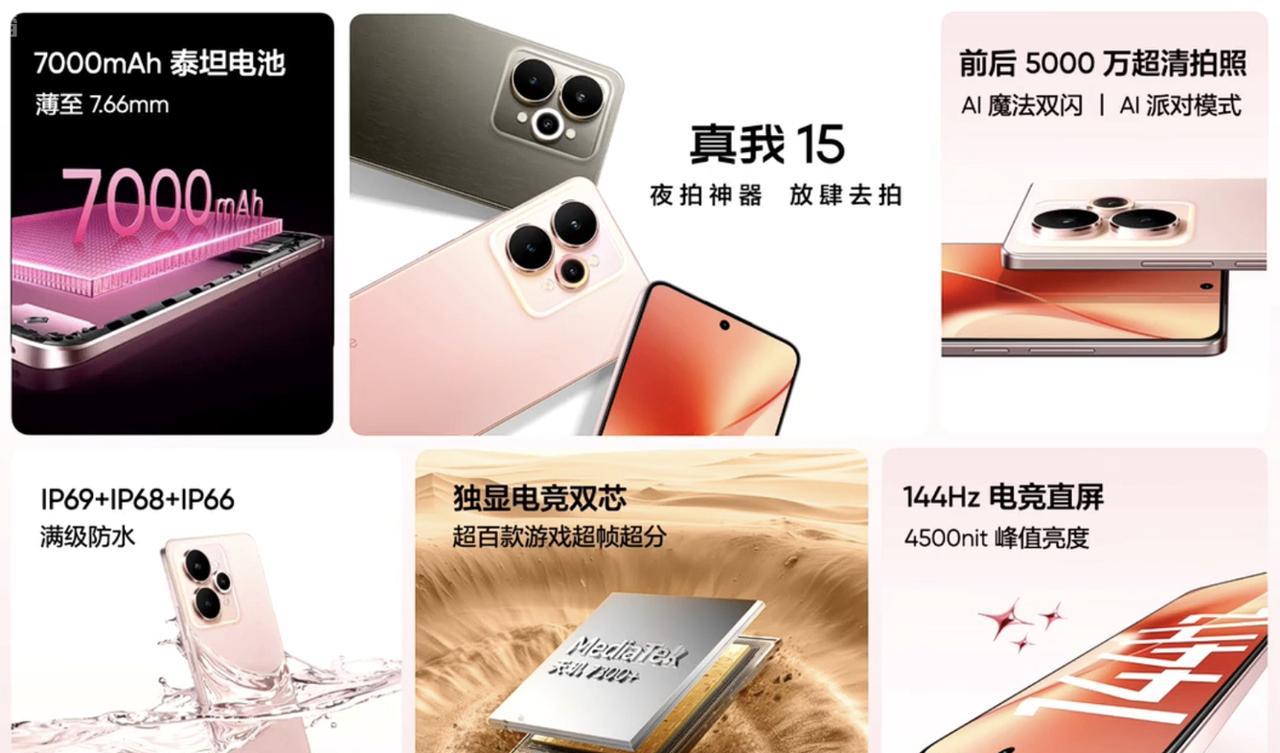 真我15系列这次总的发布了三款产品:真我15、真我15 Pro和真我15T。真我15搭载天玑7300+处理器,6.77英寸144Hz OLED直屏,后置5000万主摄 + 800万超广角双摄,内置7000mAh电池 + 80W快充,机身厚7.66mm、重185g,IP66、68、69满级防水,红外遥控、NFC、立体双扬都有。 真我15 Pro搭载骁龙7 Gen4处理器6.8英寸1.5K OLED直屏,后置5000万主摄(索尼IMX896) + 5000万超广角双摄,内置7000mAh电池 + 80W有线快充,机身厚7.79mm、重187g,IP66、68、69满级防水。 真我15T搭载天玑6400 MAX处理器,采用6.57英寸直屏,内置7000mAh电池 + 60W有线快充,机身厚7.79mm、重181g,后置5000万主摄,IP66、68、69满级防水,配备NFC、红外遥控。 讲真,你们喜欢哪款?[吐舌]