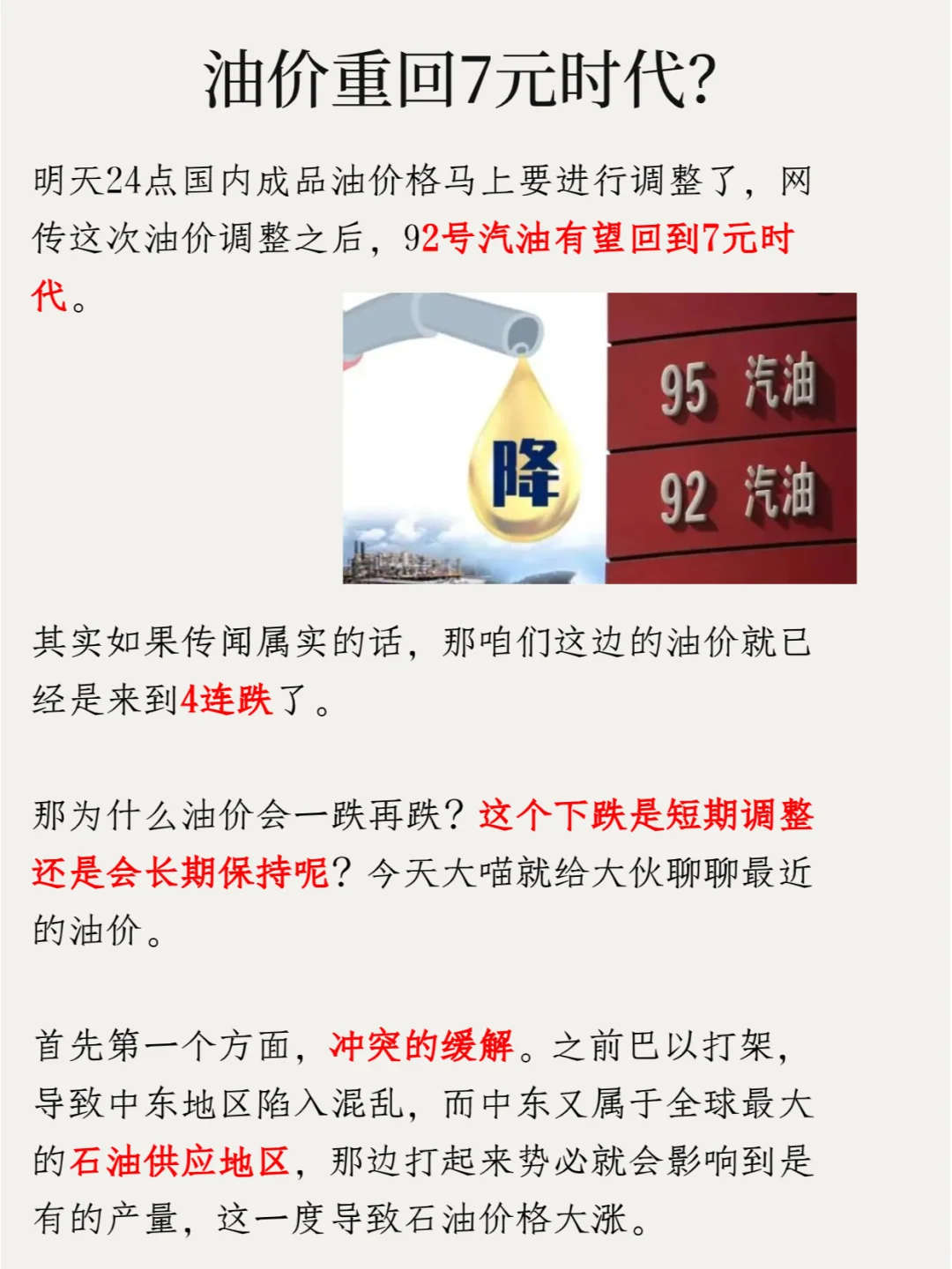 明天24点国内成品油价格马上要进行调整了,网传这次油价调整之后,92号汽油有望回到7元时代。