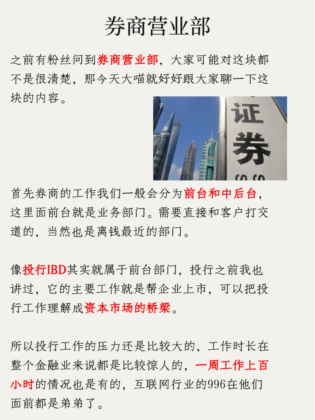 像投行IBD其实就属于前台部门,投行之前我也讲过,它的主要工作就是帮企业上市,可以把投行工作理解成资本市场的桥梁。所以投行工作的压力还是比较大的,工作时长在整个金融业来说都是比较惊人的,一周工作上百小时的情况也是有的,互联网行业的996在他们面前都是弟弟了。也因为业务的性质,它对学历的要求就会很高,当然收入也相当可观,大家可以猜一猜。