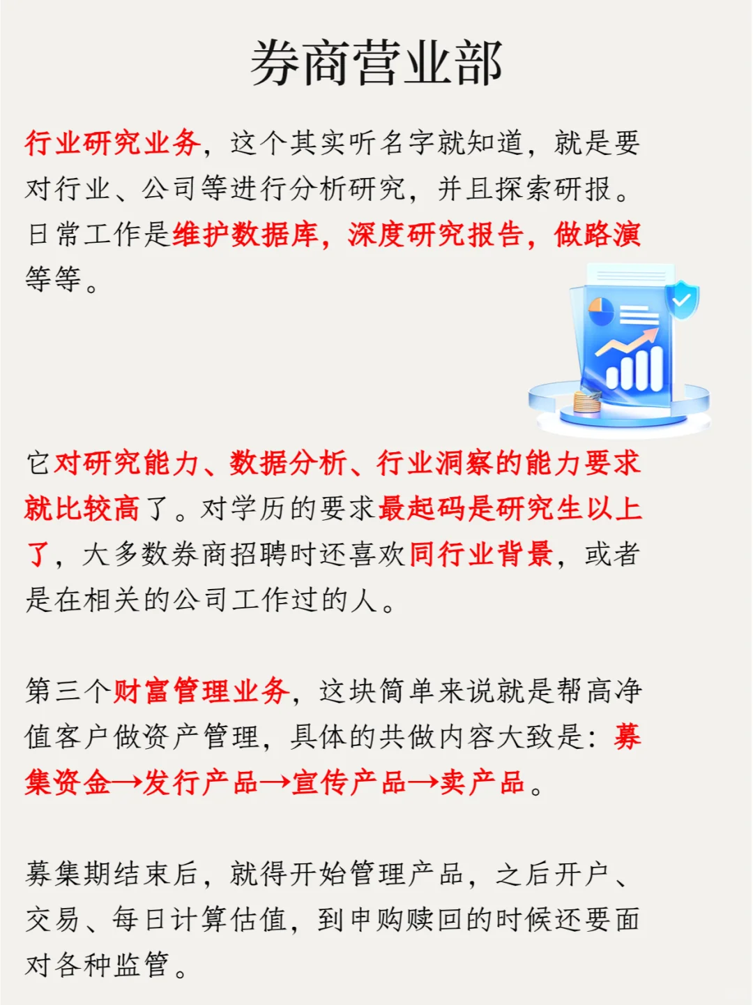 它对研究能力、数据分析、行业洞察的能力要求就比较高了。对学历的要求最起码是研究生以上了,大多数券商招聘时还喜欢欧行业背景,或者是在相关的公司工作过的人。