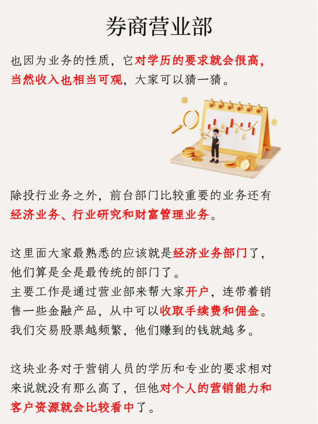 首先券商的工作我们一般会分为前台和中后台,这里面前台就是业务部门。需要直接和客户打交道的,当然也是离钱最近的部门。