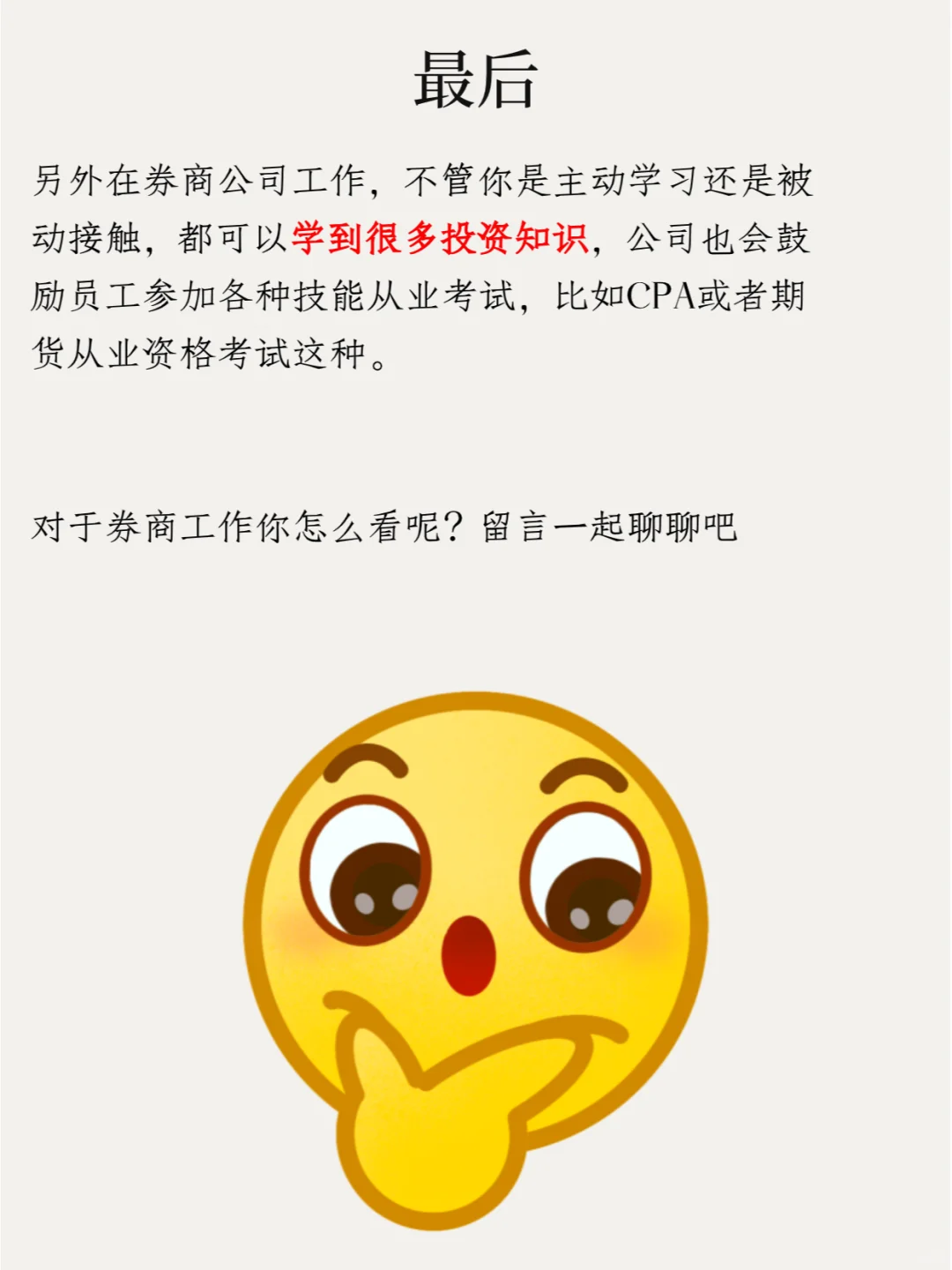 另外在券商公司工作,不管你是主动学习还是被动接触,都可以学到很多投资知识,公司也会鼓励员工参加各种技能从业考试,比如CPA或者期货从业资格考试这种。