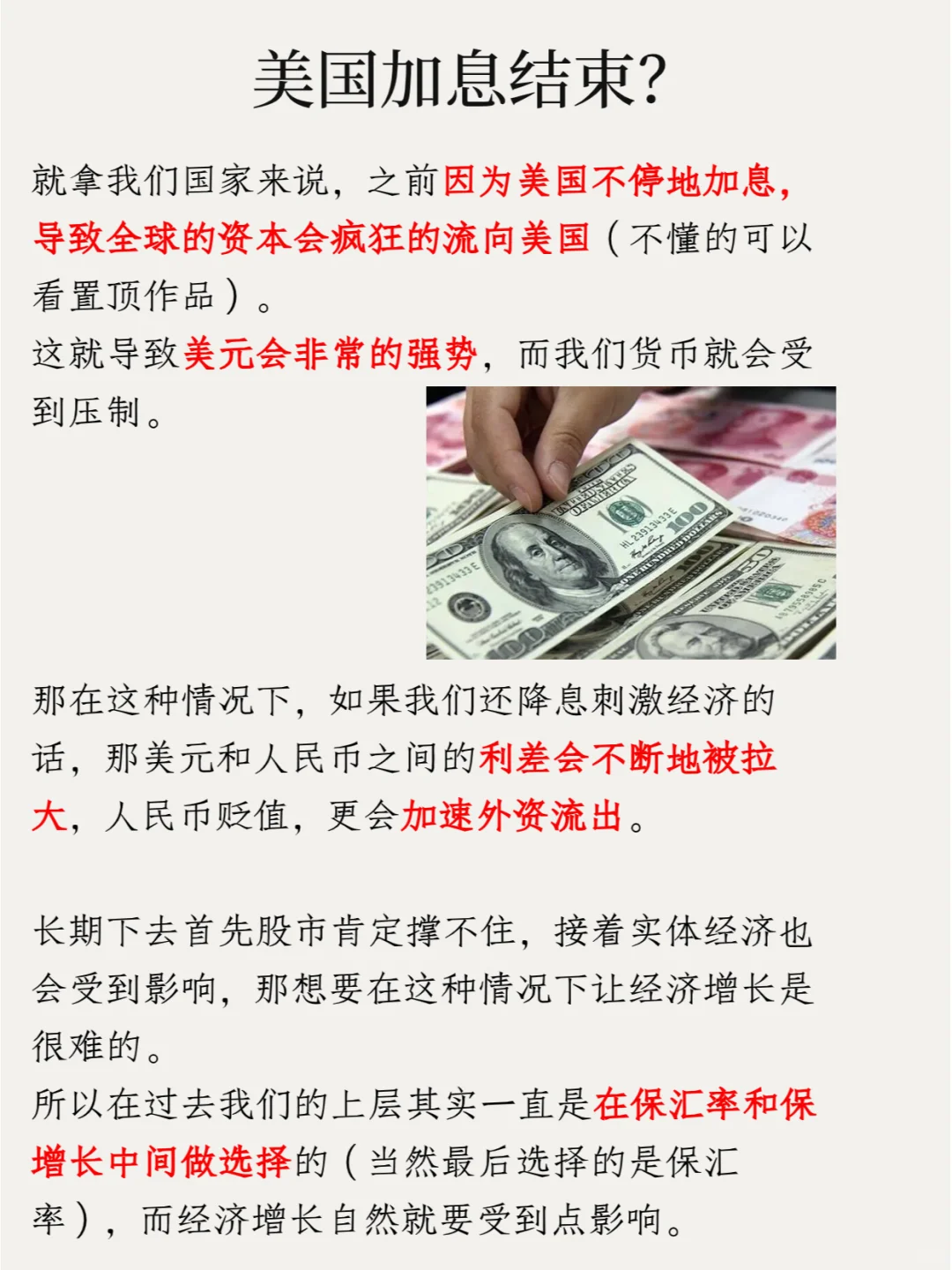就拿我们国家来说,之前因为美国不停地加息,导致全球的资本会疯狂的流向美国(不懂的可以看置顶作品),这就导致美元会非常的强势,而我们货币就会受到压制。