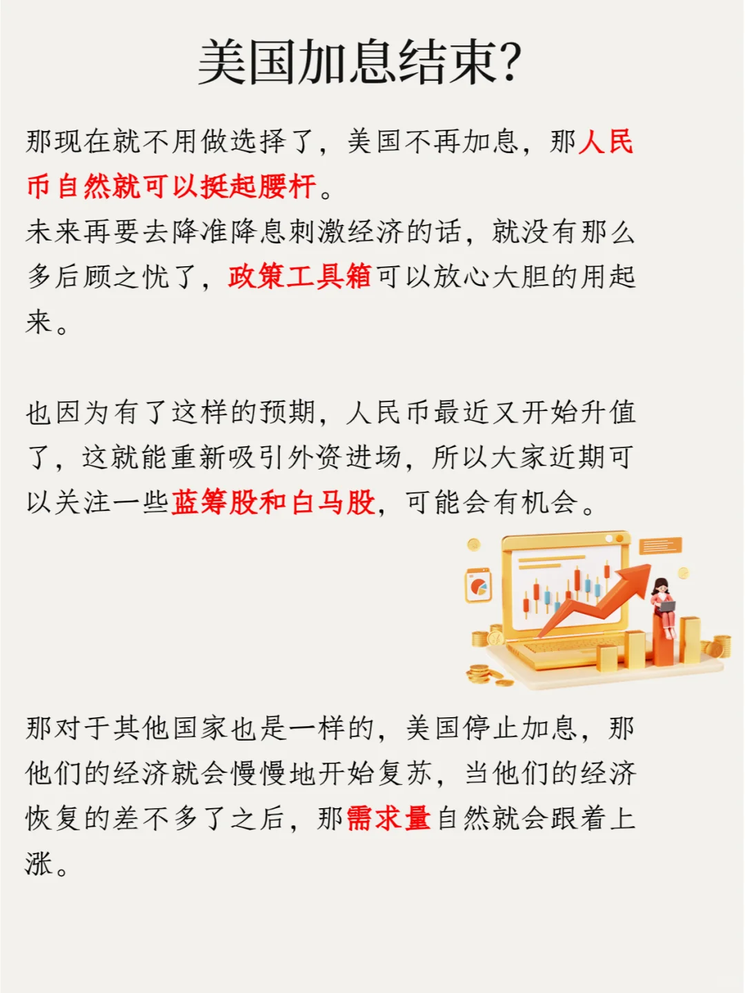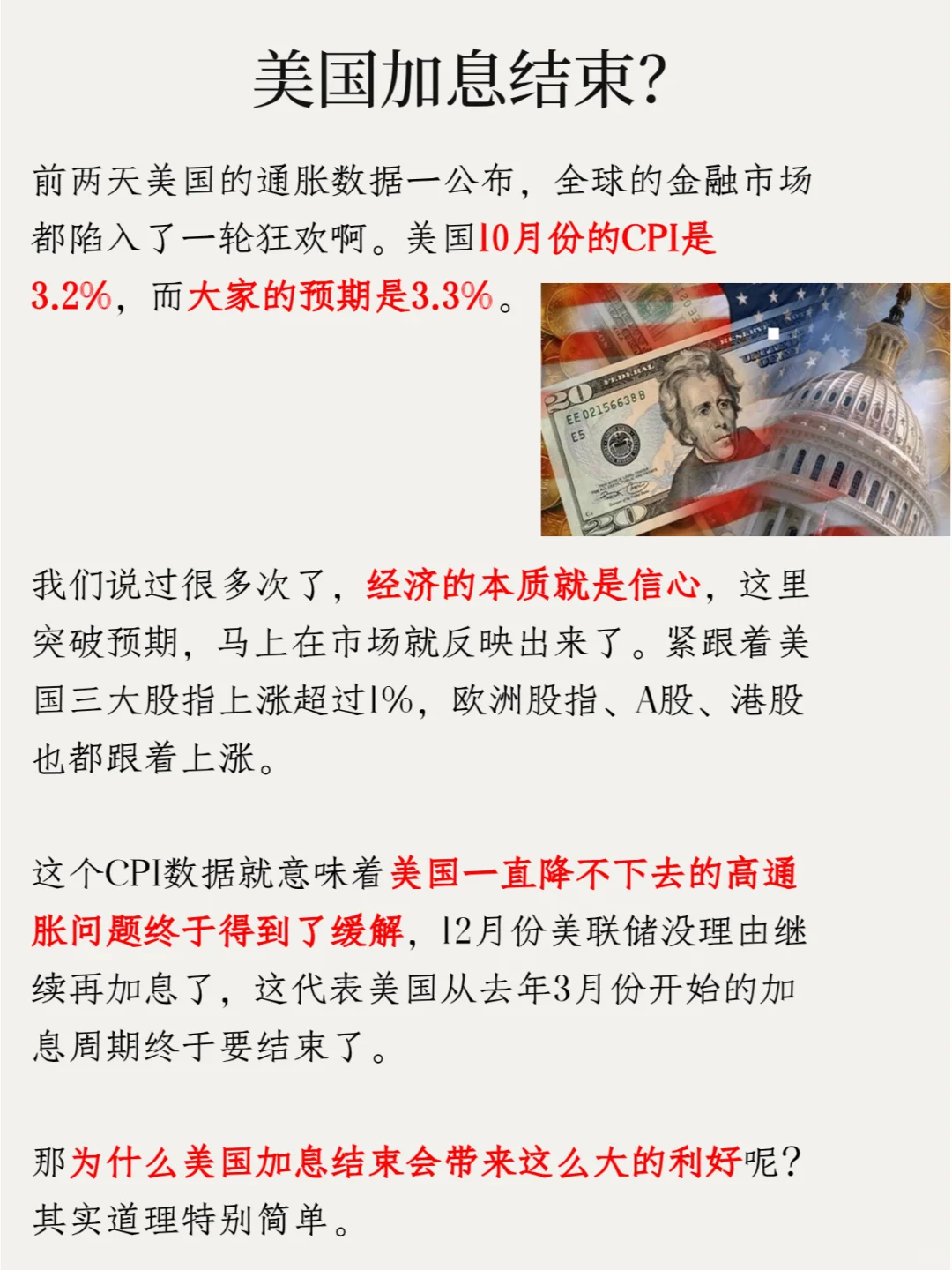 那为什么美国加息结束会带来这么大的利好呢?其实道理特别简单。