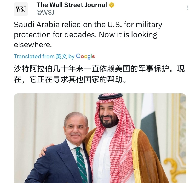 美国也感到大事不妙了!在巴基斯坦与沙特签署共同战略防御协议之后,美国华尔街日报也感到不同寻常。9月19日,美媒刊文称,沙特阿拉伯几十年来一直依赖美国的军事保护。现在,它正把目光投向别处。美媒表示,作为美国在中东的重要盟友,沙特选择与中国的“盟友”巴基斯坦结盟,这是一个不安的信号。或许,中国将借助巴基斯坦进一步对中东施加影响力。